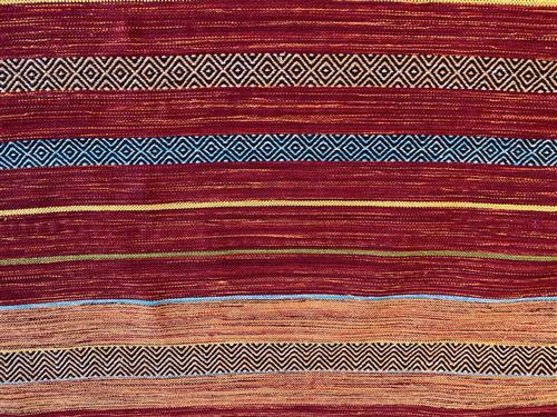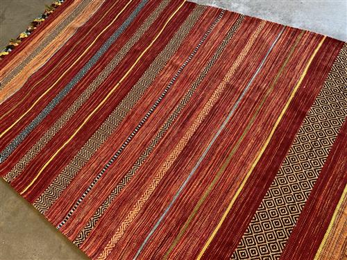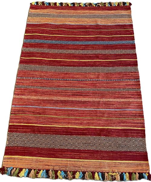 A VIBRANT CHENILLE FLEECE KILIM WITH COLOURFUL TASSEL FRINGES. HAND-WOVEN AND REVERSABLE. ORIGIN: RAJASTHAN (230 X 160 CM) (PLEASE NOTE THERE MAY BE SOME COLOUR VARIATION FROM PHOTOGRAPH)