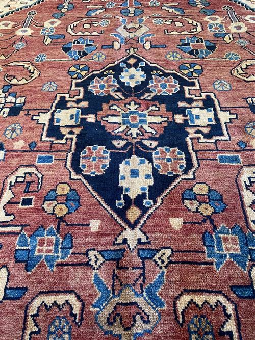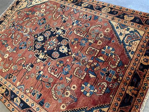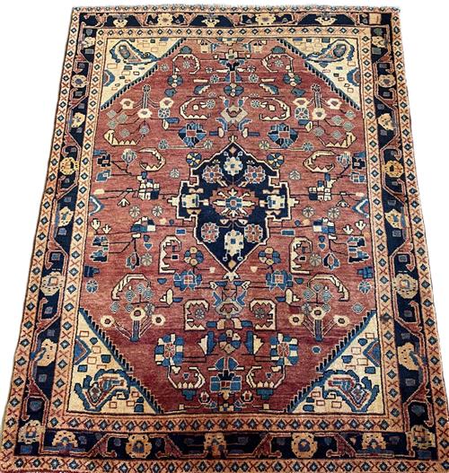 A PERSIAN NAHAVAND WOOL RUG WITH NATURAL DYES. HAND-KNOTTED VILLAGE WEAVE WITH A CENTRAL MEDALLION WITHIN A FIELD OF VARYING ANGULAR FLORAL MOTIFS. BORDER OF FLOWER HEADS AND TENDRILS. THE ENTIRE IN SHADES OF TERRACOTTA, INDIGO, CREAM AND BLUE. IN EXCELLENT CONDITION. ORIGIN: IRAN (203 X 149 CM) (PLEASE NOTE THERE MAY BE SOME COLOUR VARIATION FROM PHOTOGRAPH)