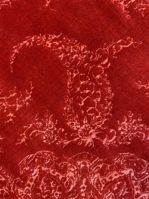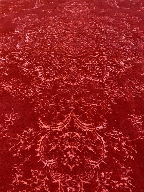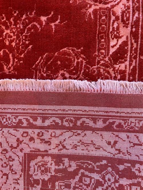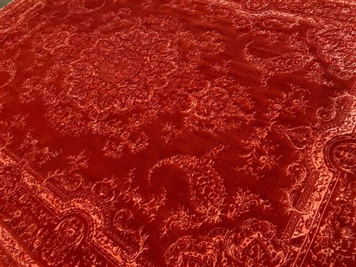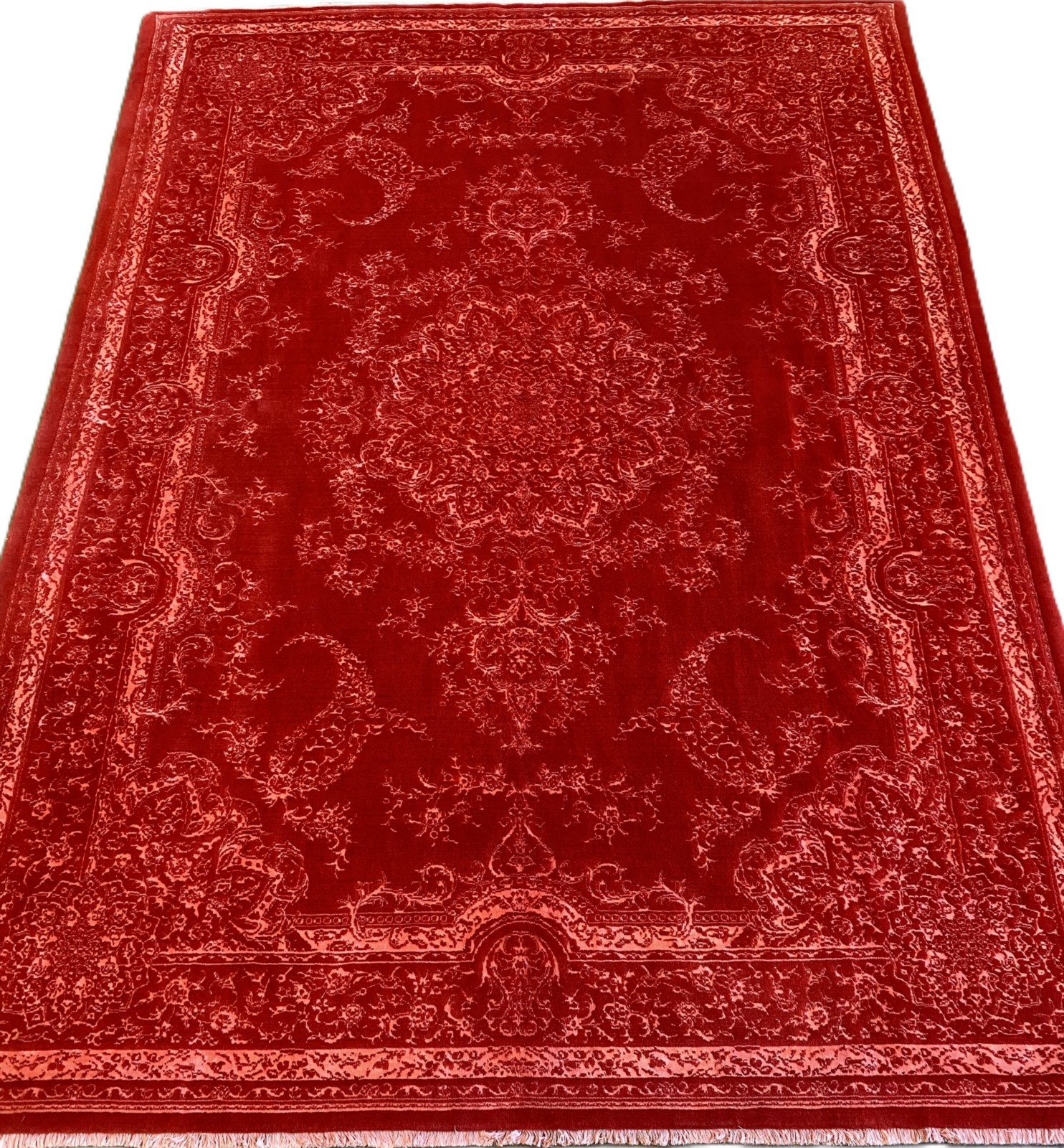 A NEW PERSIAN TRANSITIONAL DANCING FLOWER DESIGNER WOOL RUG, HANDMADE LOOM KNOT. TRANSITIONAL PERSIAN FLORAL DESIGN OF EMBOSSED BOLD DOMINANT MEDALLION, BOLD PAISLEY PATTERNS AND FLORAL BORDER IN PEACH SET WITHIN A CRIMSON FIELD. GALLERY DISPLAYED. CERTIFICATE OF AUTHENTICITY & ORIGIN ON REQUEST. ORIGIN: IRAN (344 X 253 CM) (PLEASE NOTE THERE MAY BE SOME COLOUR VARIATION FROM PHOTOGRAPH)