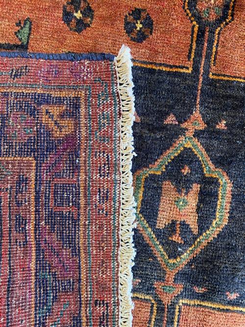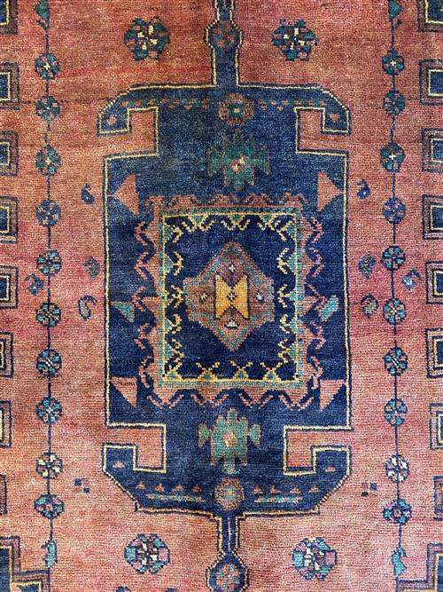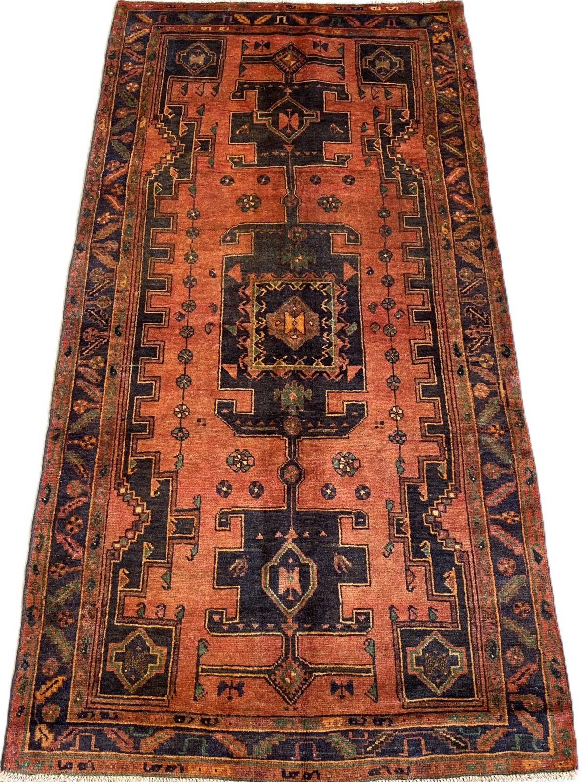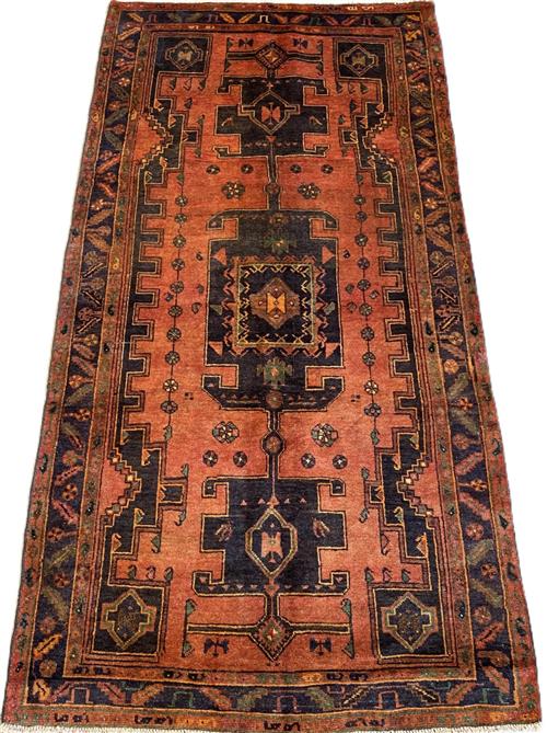 A TRIBAL PERSIAN TAJABAD WOOL ENTRANCE RUG. VILLAGE WEAVE FROM THE NATANZ COUNTY IN THE ISFAHAN PROVINCE, WITH TRIBAL DESIGN OF BOLD ANCHORED MEDALLION SET WITHIN A TERRACOTTA-TONED FIELD OF SECONDARY FLORAL PATTERNS. BORDER OF ROSETTES AND LEAVES. IN EXCELLENT CONDITION. ORIGIN: IRAN (290 X 146 CM) (PLEASE NOTE THERE MAY BE SOME COLOUR VARIATION FROM PHOTOGRAPH)