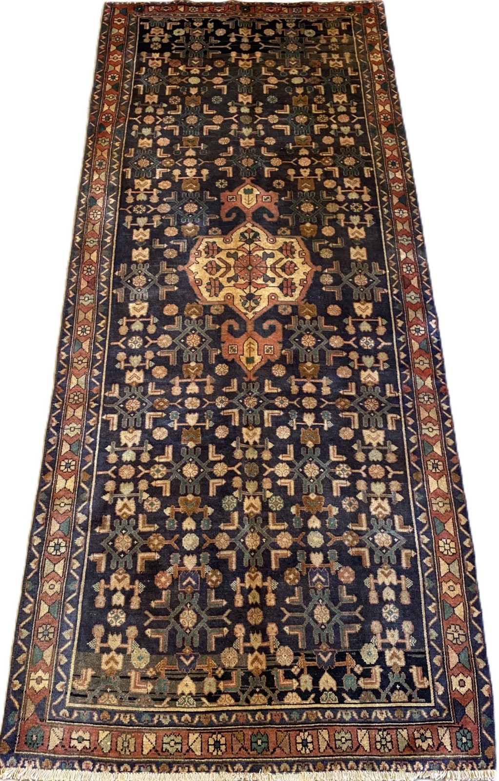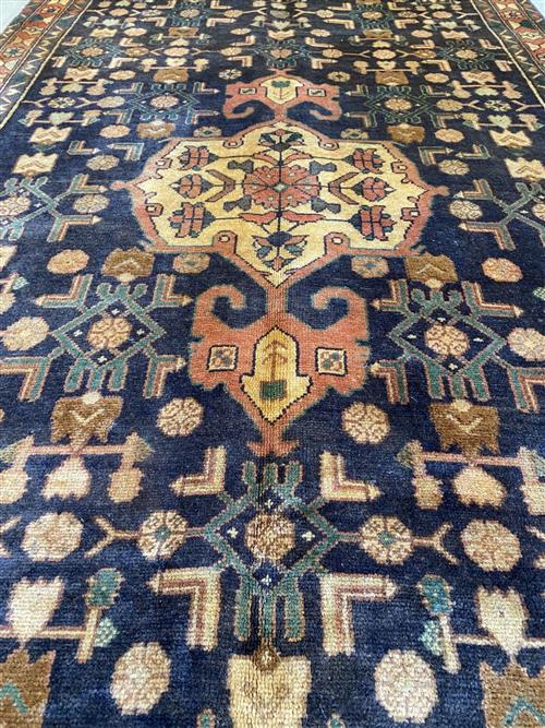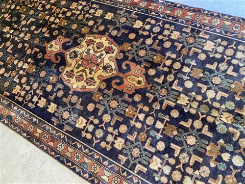 A PERSIAN MALAYER WOOL HALL RUNNER. HAND-KNOTTED CITY WEAVE FROM THE HAMADAN PROVINCE WITH TRADITIONAL DESIGN OF ANCHORED MEDALLION WITHIN A FIELD OF BOLD HERATI MAHI MOTIFS. BORDER OF FLOWER HEADS AND GEOMETRIC PATTERNS. IN EXCELLENT CONDITION. ORIGIN: IRAN (316 X 127 CM) (PLEASE NOTE THERE MAY BE SOME COLOUR VARIATION FROM PHOTOGRAPH)