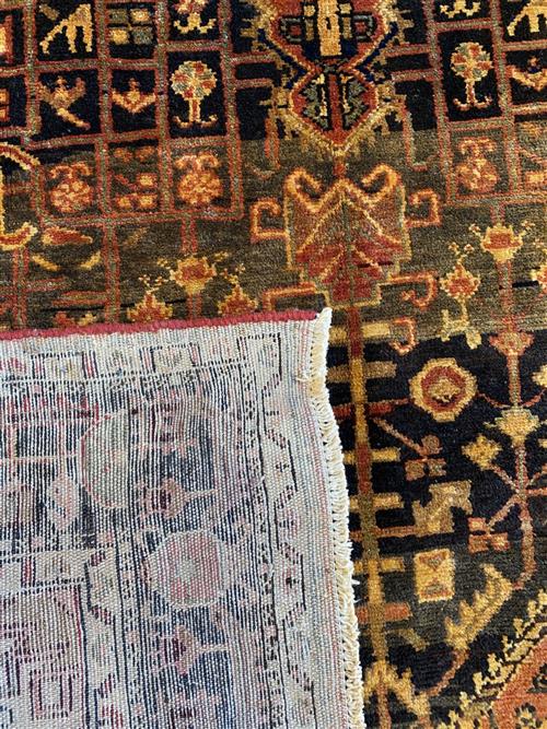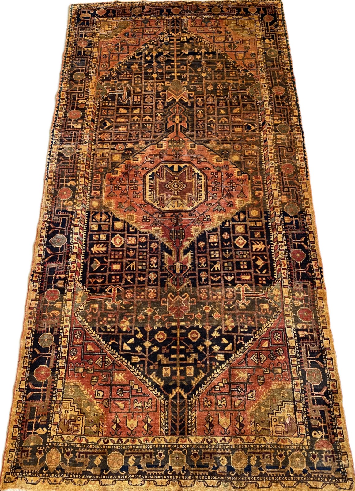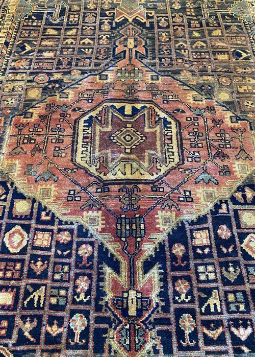 A TRIBAL PERSIAN TOYSERKAN WOOL RUG WITH ORGANIC DYES. NATURAL ABRASH DISCOLOURATION. HAND-KNOTTED VILLAGE WEAVE WITH A CENTRAL ANCHORED MEDALLION IN A PANELLED FIELD OF FLORAL, GEOMETRIC AND ANIMAL PATTERNS. BORDER OF ROSETTES AND GEOMETRIC PATTERNS. IN TONES OF INDIGO, CREAM AND RUST. ORIGIN: IRAN (324 X 161 CM) (PLEASE NOTE THERE MAY BE SOME COLOUR VARIATION FROM PHOTOGRAPH)