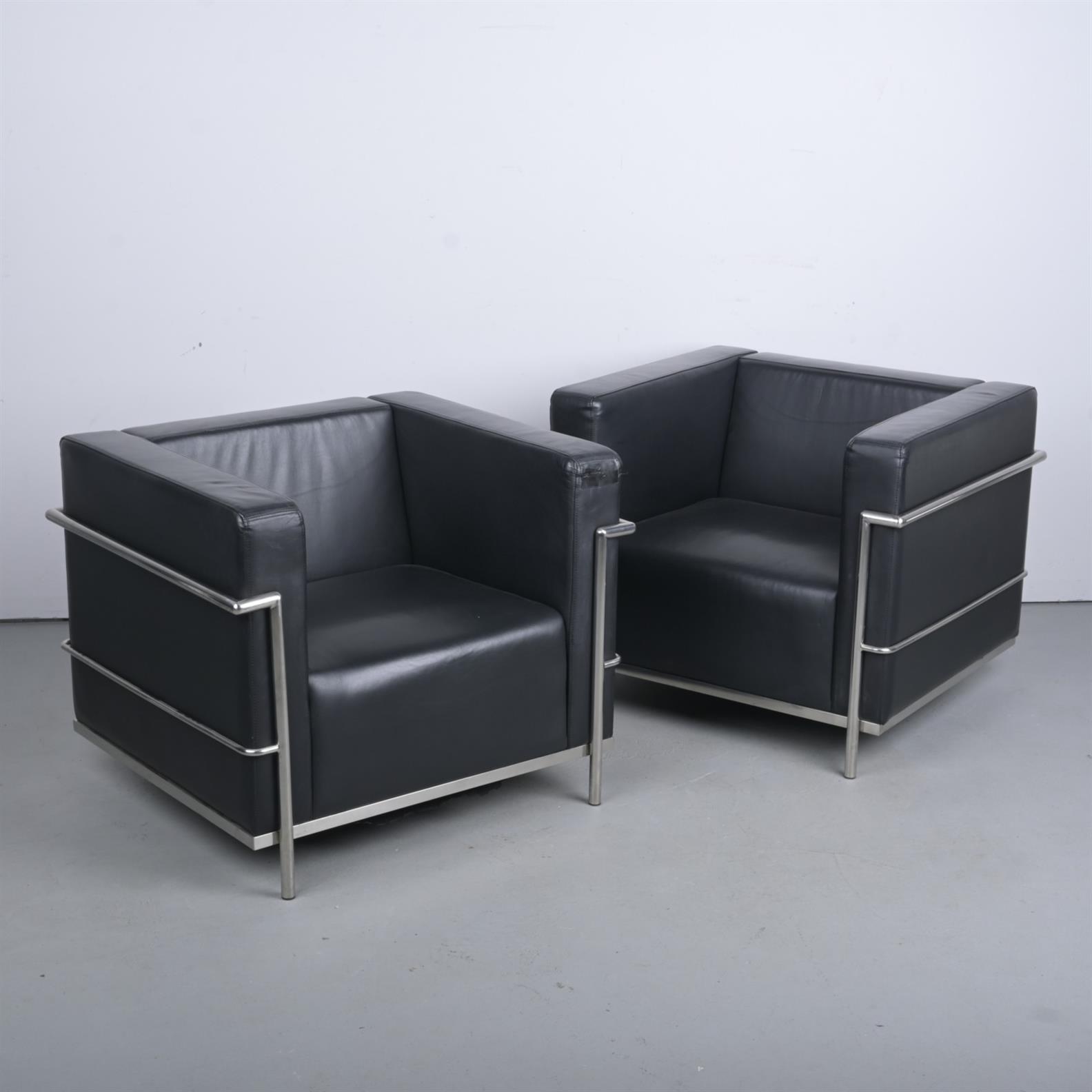 A PAIR OF BLACK LEATHER LOUNGE CHAIRS IN THE STYLE OF LE CORBUSIER LC2 (A/F) (73H X 90W X 80D CM) (THIS ITEM MUST BE REMOVED BY CARRIERS AT THE CUSTOMER'S EXPENSE. LEONARD JOEL STAFF CANNOT ASSIST CARRYING THIS ITEM.)