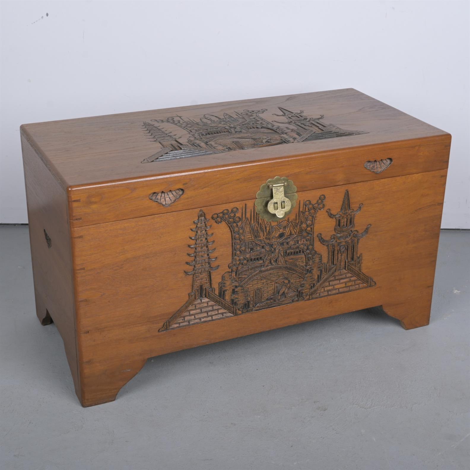 A CAMPHOR TRUNK WITH SINGAPOREAN MAKERS PLATE (56H X 100W X 49D MC) (THIS ITEM MUST BE REMOVED BY CARRIERS AT THE CUSTOMER'S EXPENSE. LEONARD JOEL STAFF CANNOT ASSIST CARRYING THIS ITEM.)