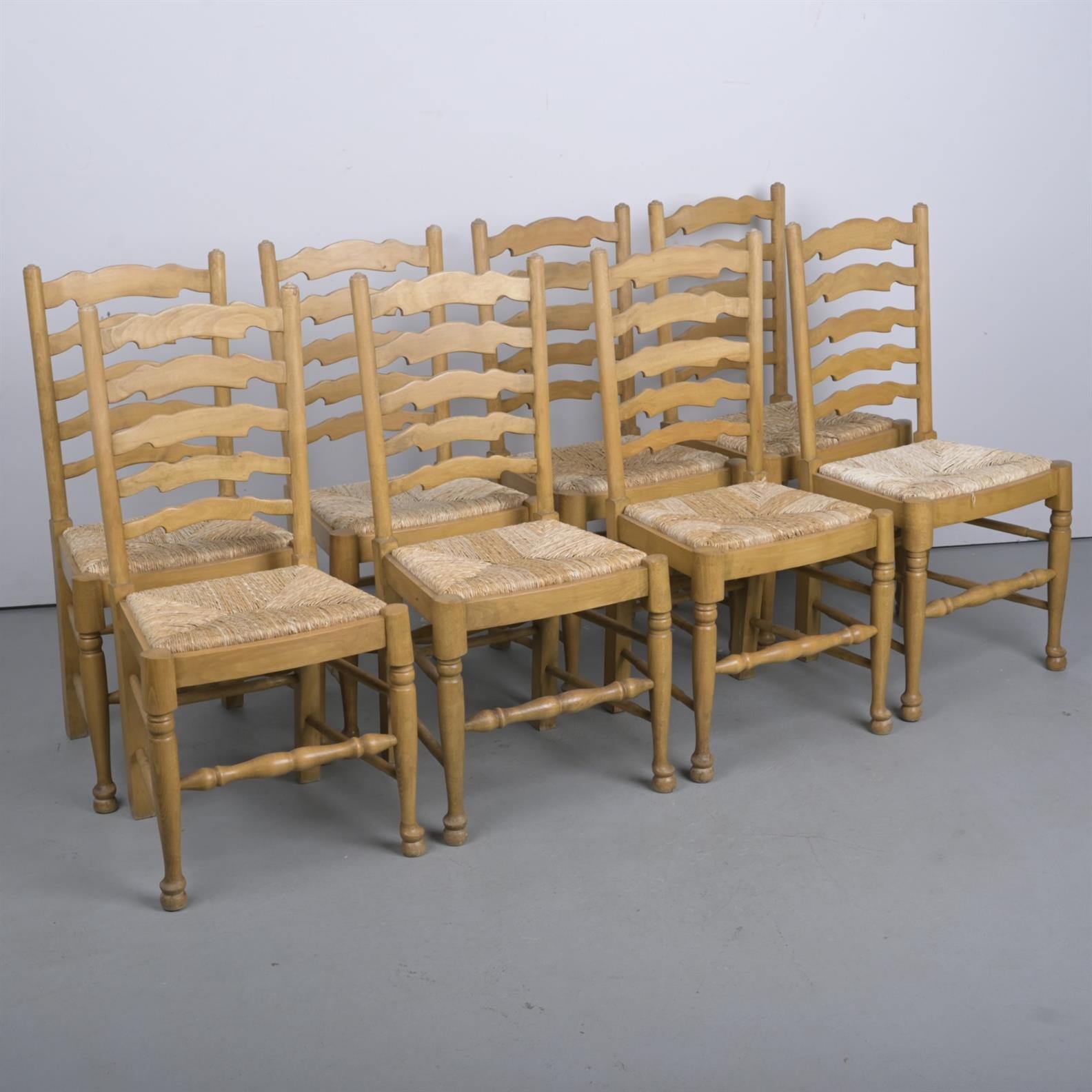 A SET OF EIGHT PROVINCIAL GEORGE III-STYLE DINING CHAIRS, EACH WITH RUSH SEAT (A/F) (100H X 50W X 43D CM)