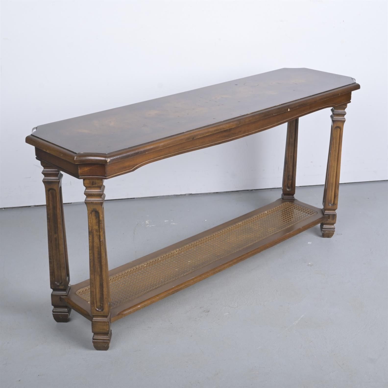 A 1970s TWO-TIER SIDE TABLE, THE LOWER TIER CANED (A/F) (69H X 137W X 39D CM)