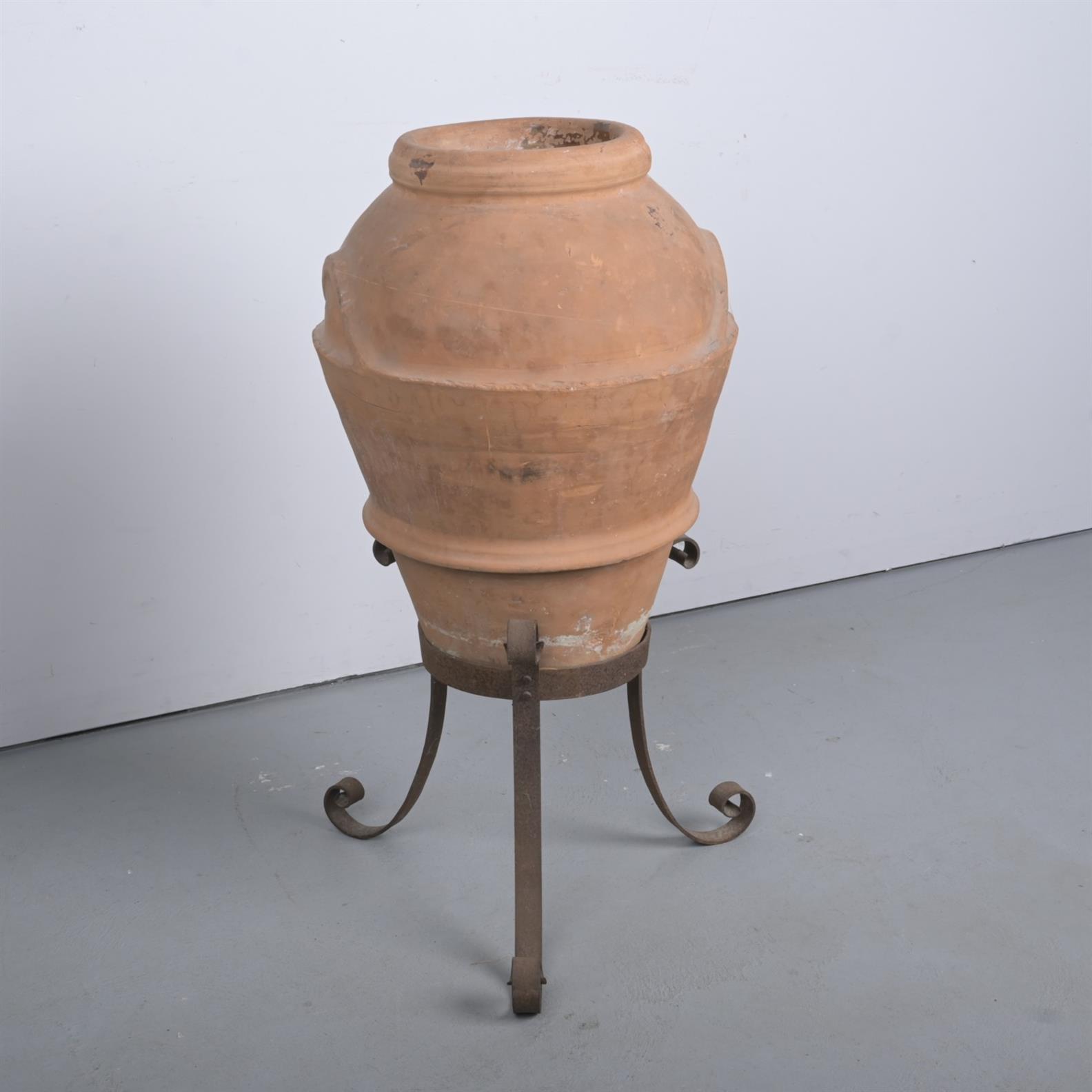 A TERRACOTTA POT ON WROUGHT IRON STAND (100H X 46DIA CM)