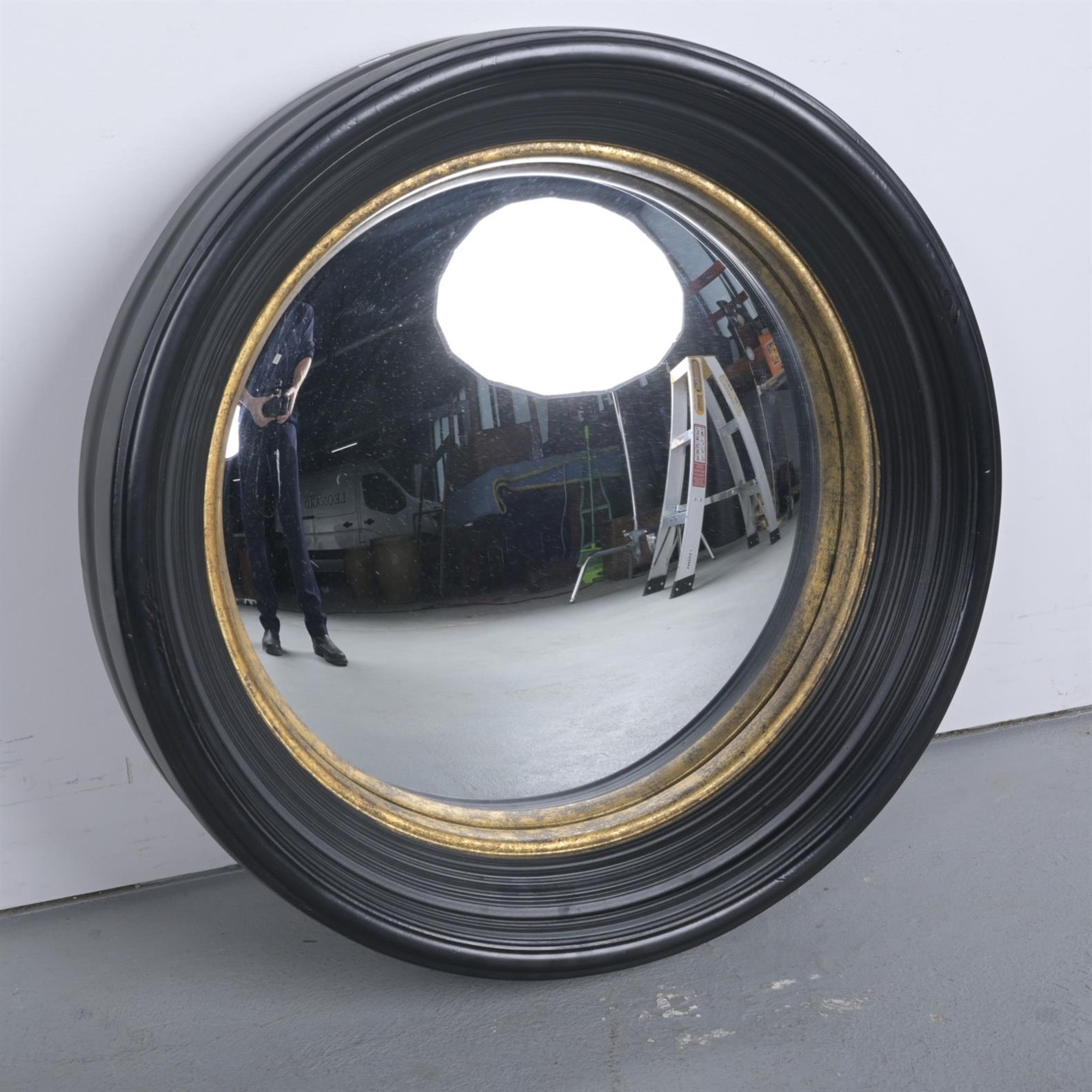 AN EBONISED CONVEX MIRROR WITH GILT TRIM (66DIA CM)