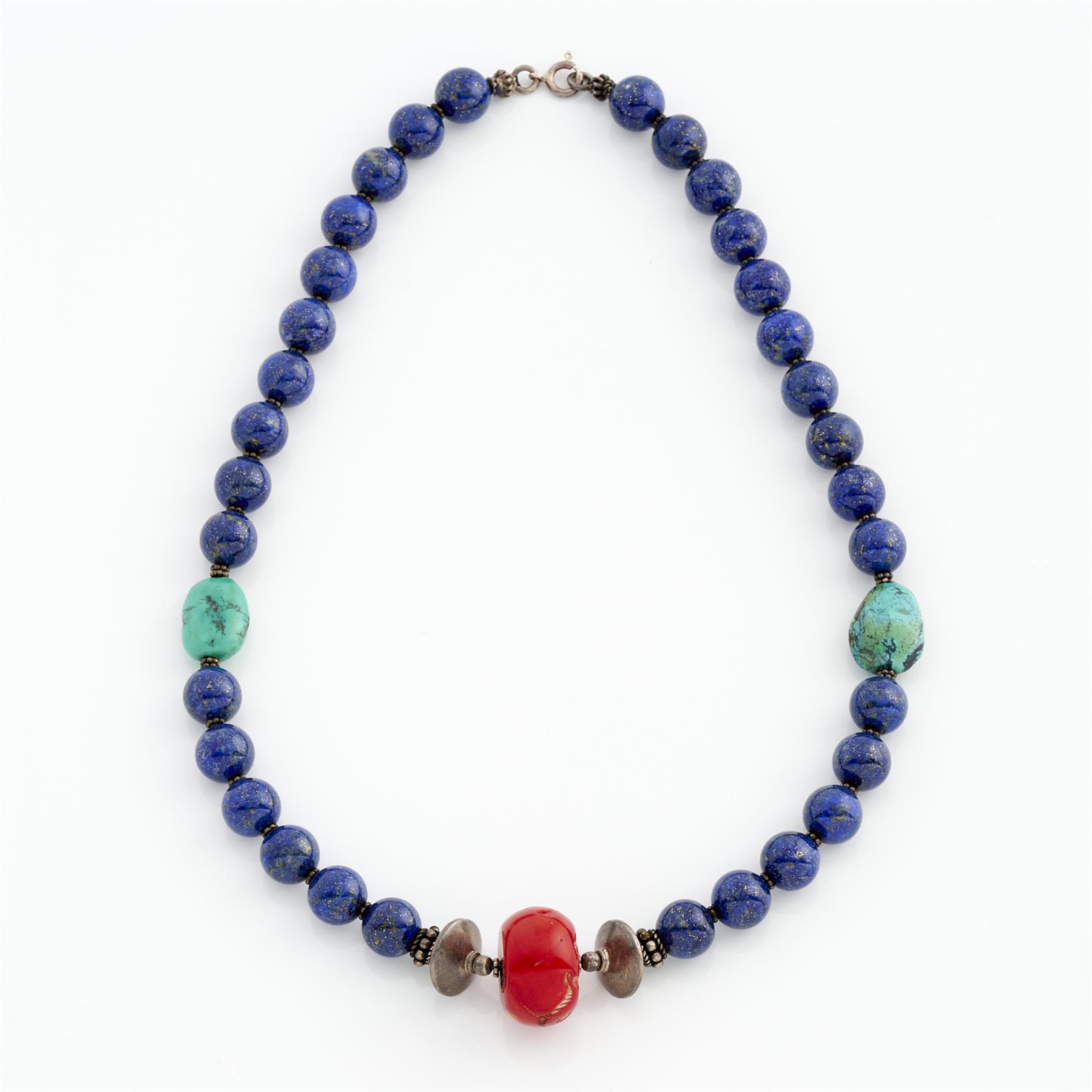 A LAPIS, CORAL AND TURQUOISE NECKLACE IN SILVER, 550MM
