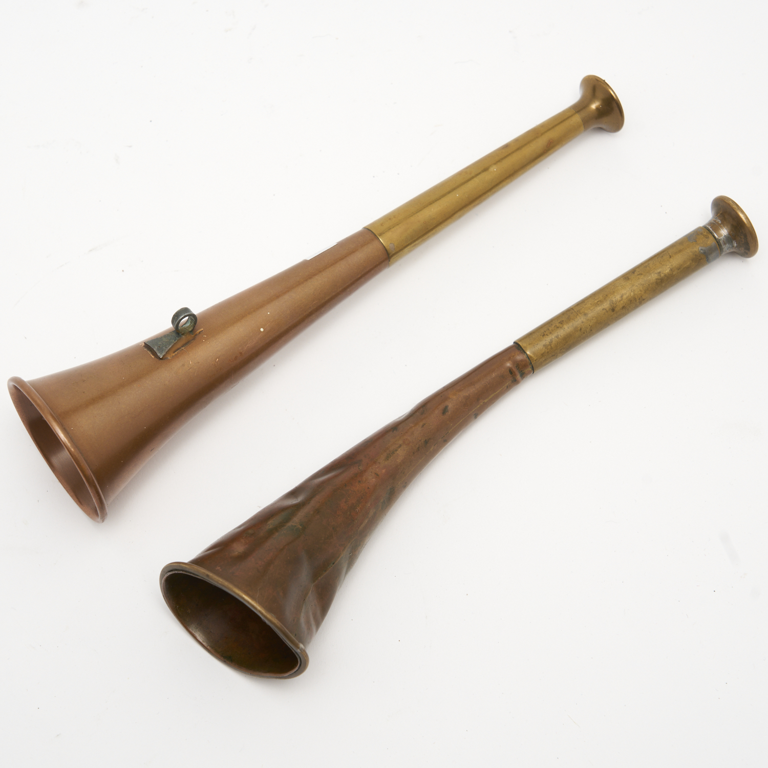 A PAIR OF 19TH CENTURY ENGLISH COPPER AND BRASS FOX HUNTING HORNS (A/F) L.22.5CM