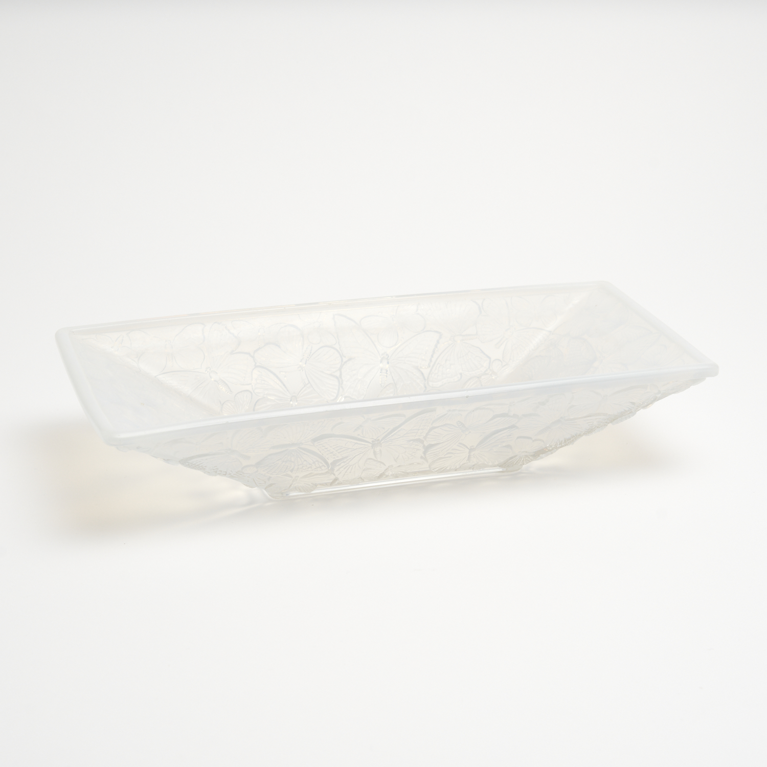 A 1920S ENGLISH JOBLING RECTANGULAR OPALESCENT CENTRE BOWL WITH BUTTERFLY DECORATION W.35CM