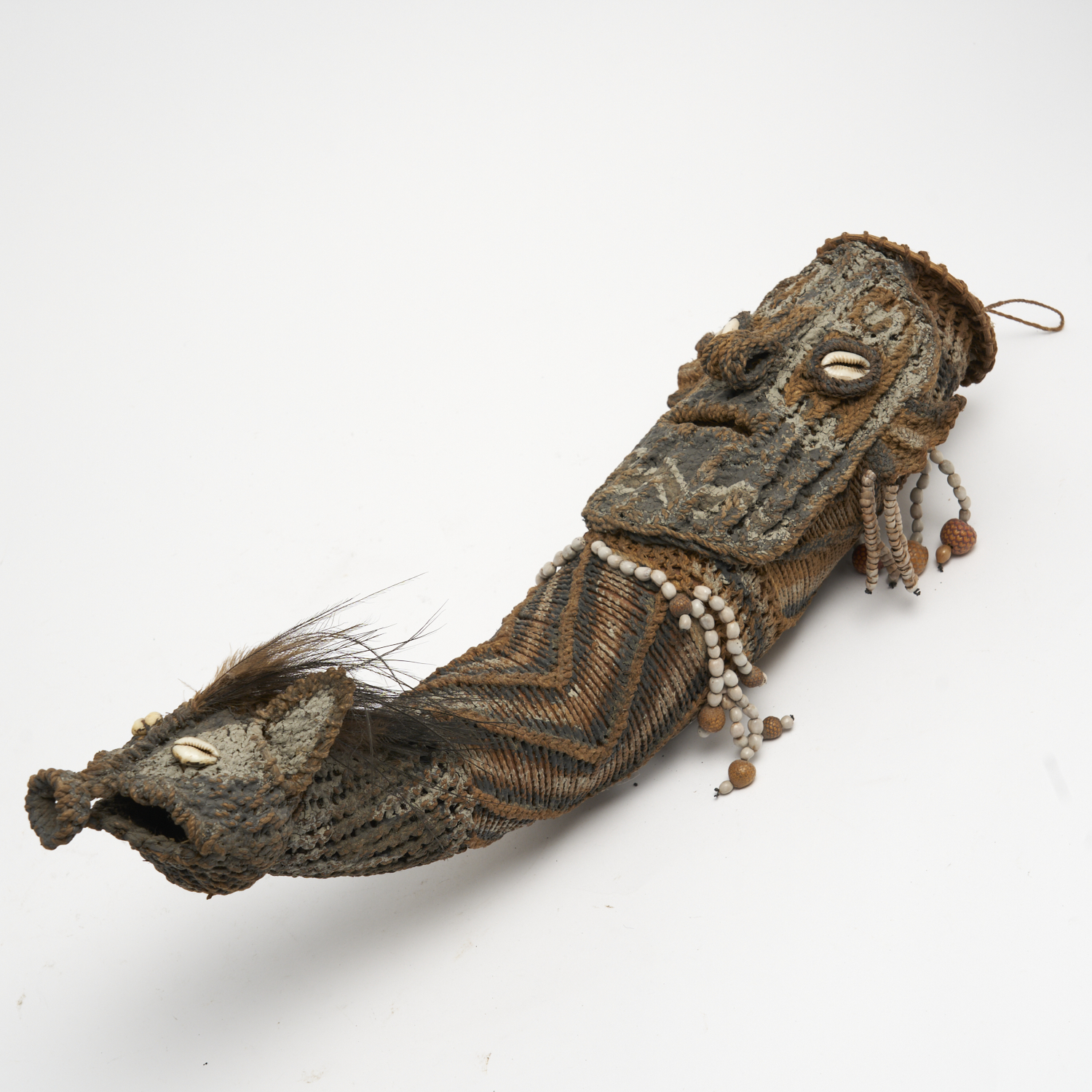 A PAPUA NEW GUINEA WOVEN AND HANDPAINTED SEAGRASS HANGING FIGURE WITH SHELL AND FEATHER ADORNMENTS L.55CM