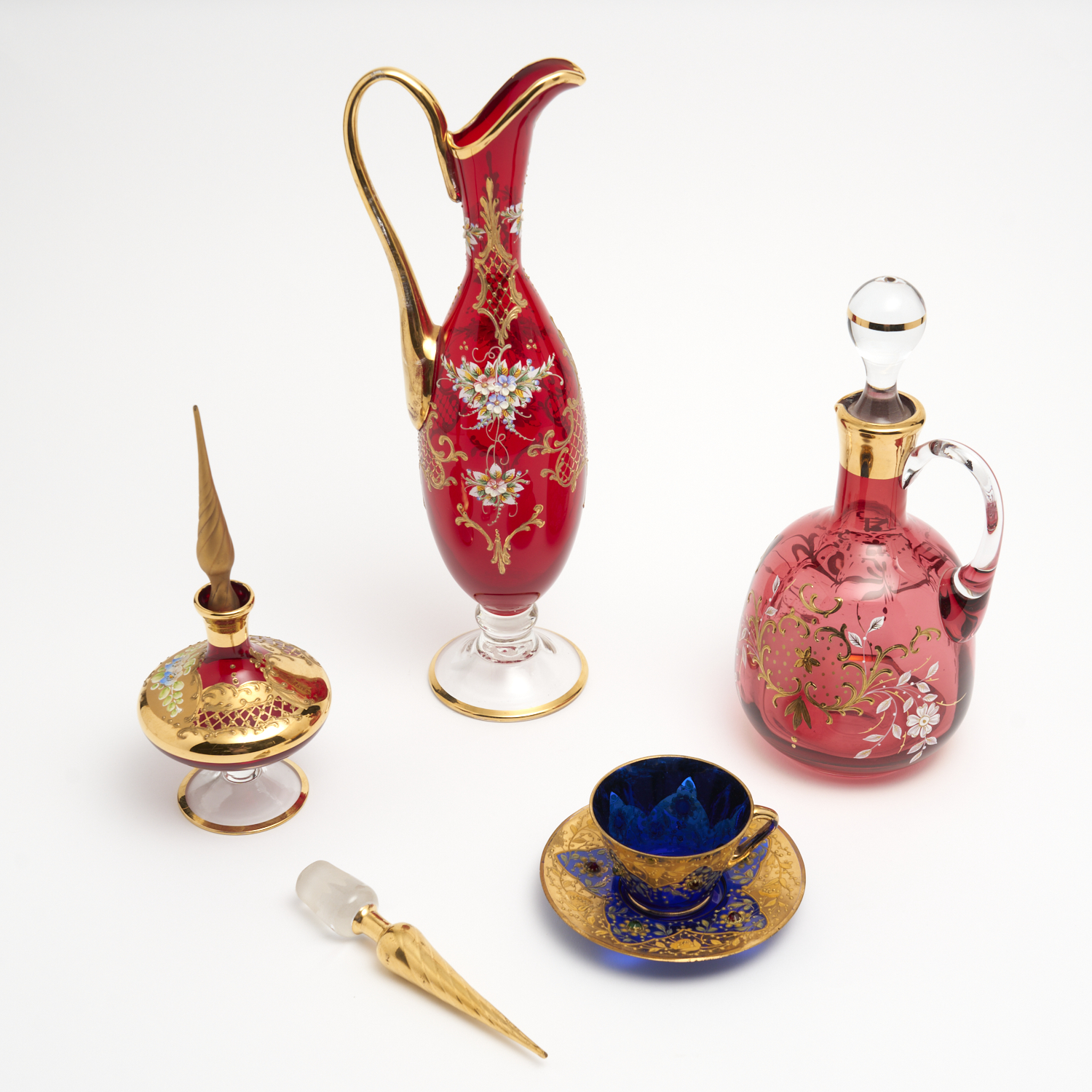 A GROUP OF THREE ITALIAN RUBY GLASS DECANTERS WITH HAND PAINTED ENAMEL AND GILDED DECORATION AND SIMILAR BLUE CUP AND SAUCER WITH SEMI PRECIOUS ADORNED JEWELS H.28CM (TALLEST)