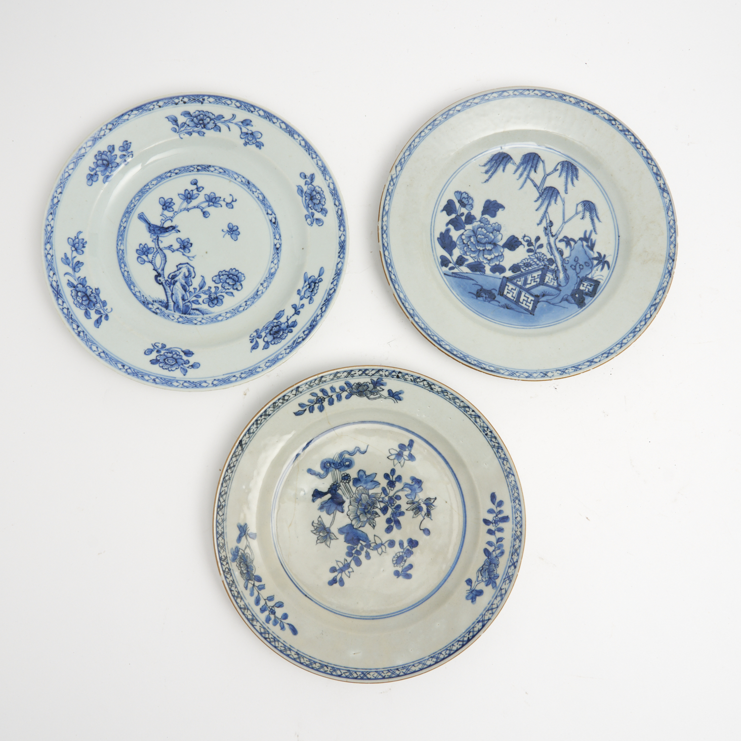 A GROUP OF THREE CHINESE BLUE AND WHITE PLATES (A/F) DIA.23CM