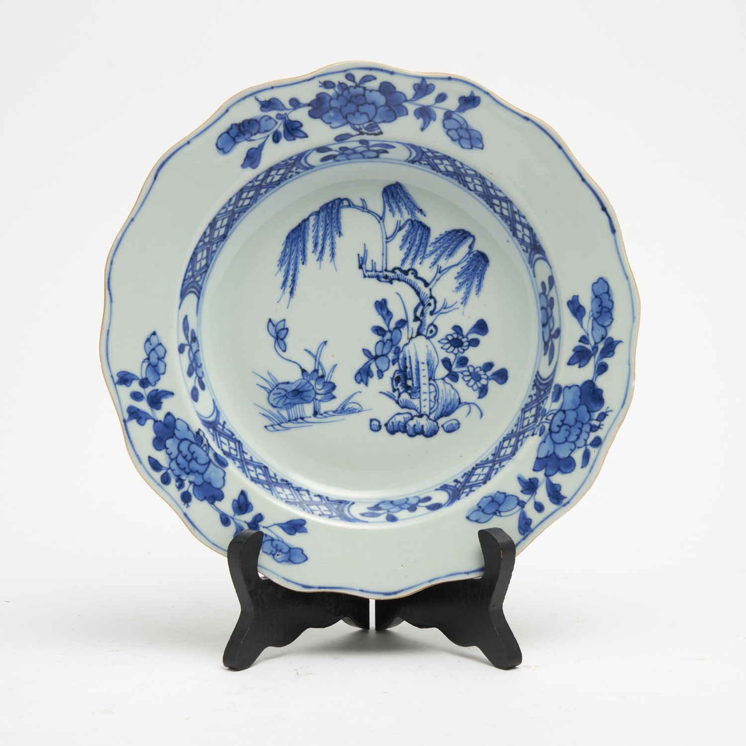A CHINESE BLUE AND WHITE PLATE WITH WILLOW TREE DECORATION TO CENTRE DIA.22.5CM