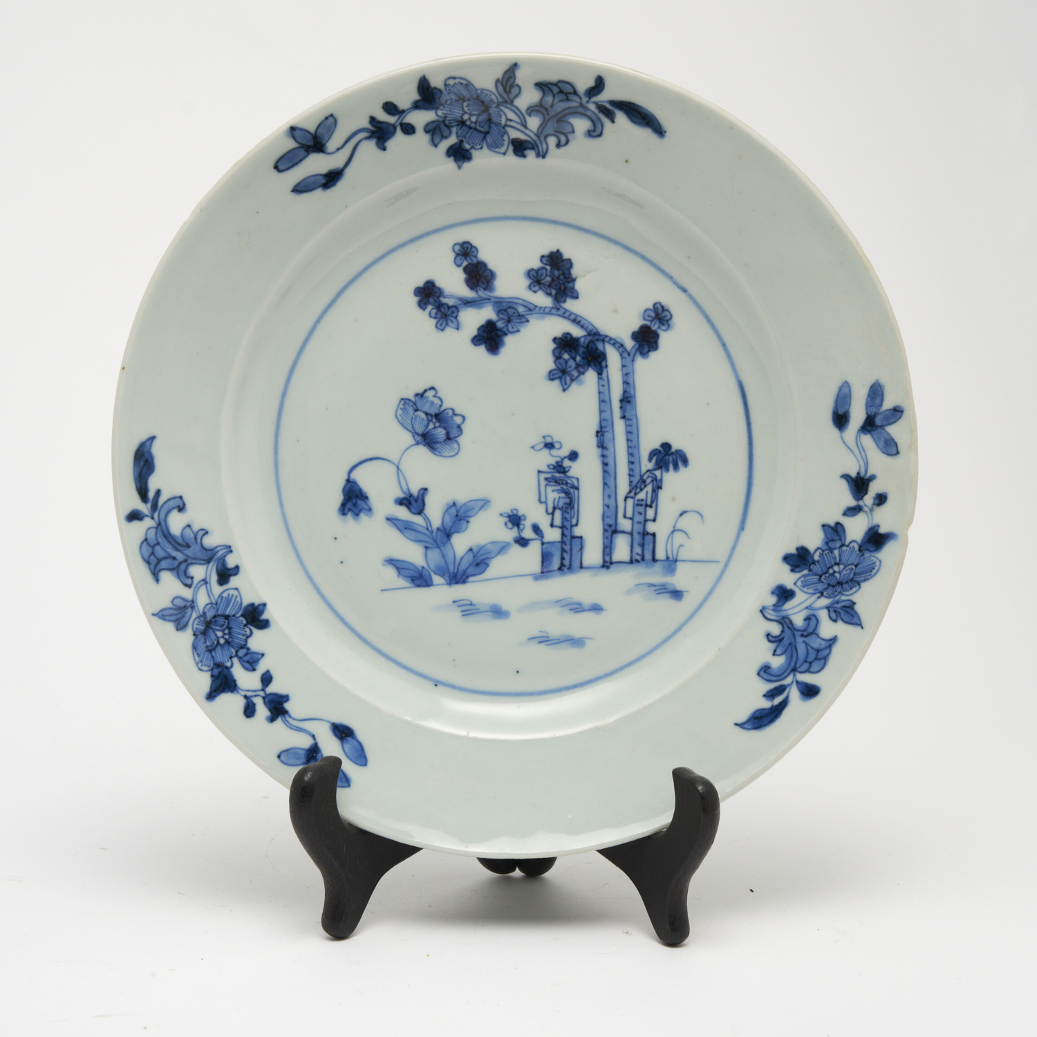 A CHINESE BLUE AND WHITE PLATE WITH TREE DECORATION TO CENTRE DIA.23CM