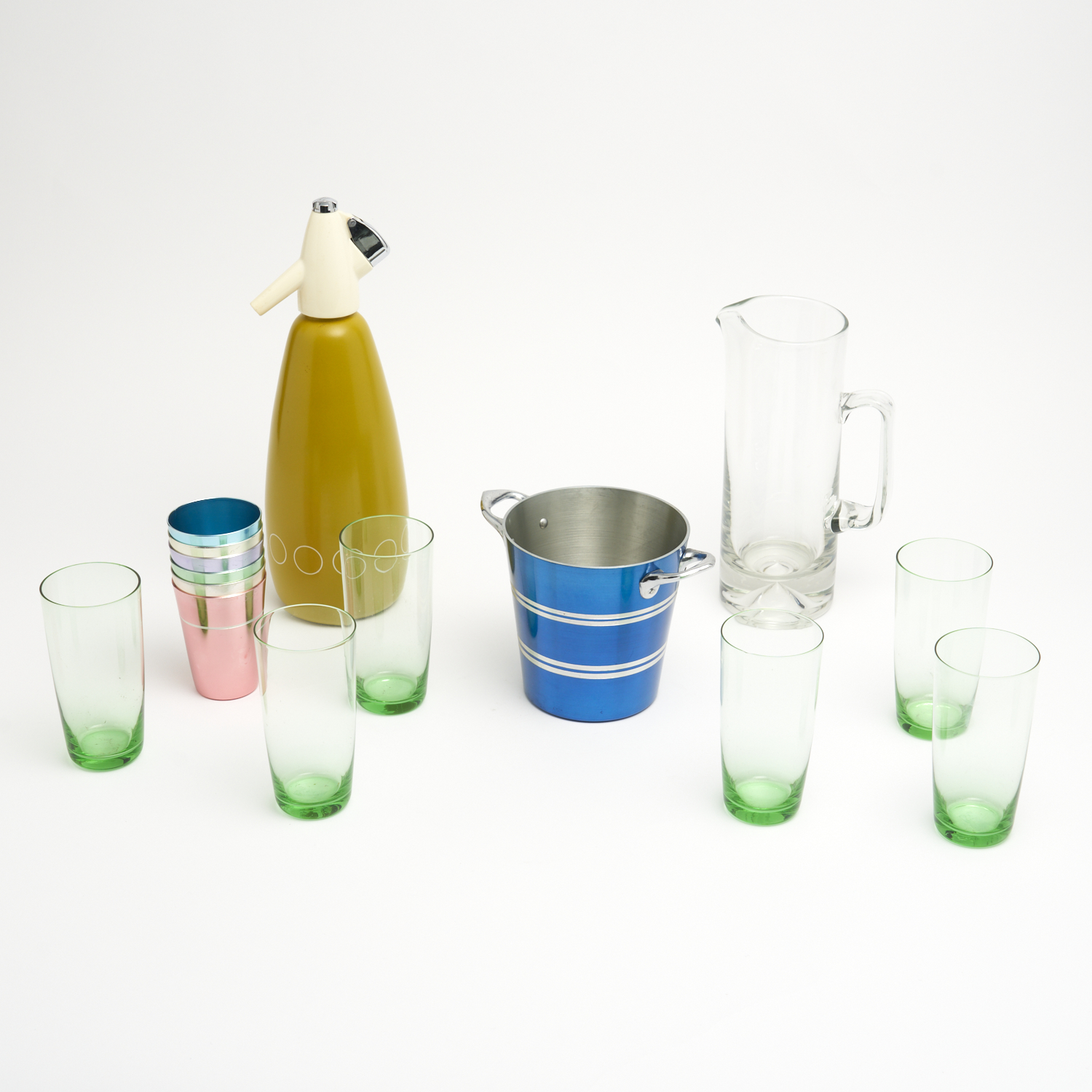 AN ASSEMBLED SET OF ANNODISED SODA SIPHON STACKING CUPS AND ICE BUCKET AND COMPLEMENTING WATER JUG AND SIX RETRO GREEN TUMBLERS H.32CM (TALLEST)