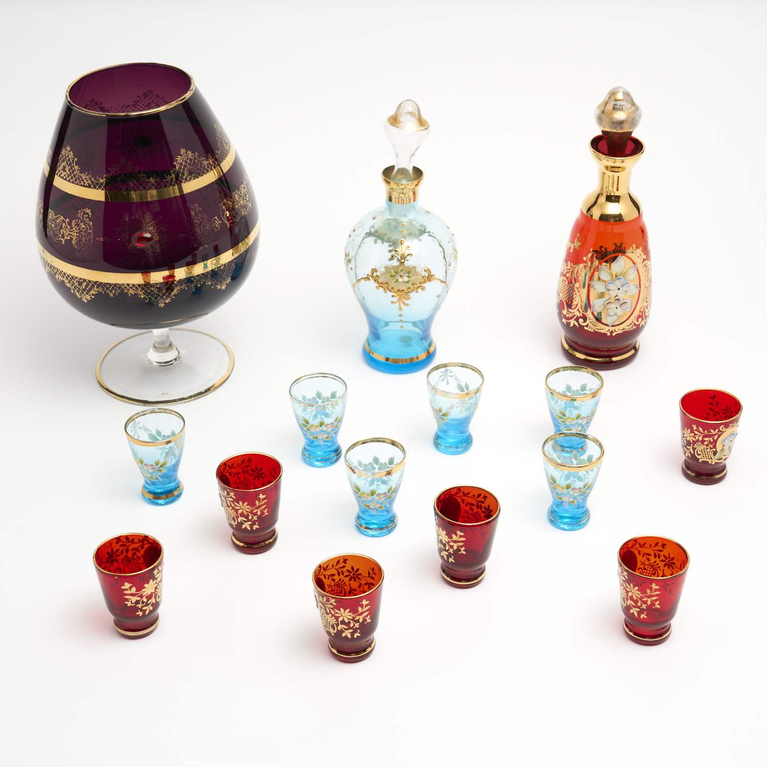 TWO SETS OF VENETIAN RUBY AND BLUE GLASS DECANTERS AND MATCHED SIX GLASSES TOGETHER WITH A LARGER JEWELLED AND GILDED GOBLET FORM VASE H.28CM (TALLEST)