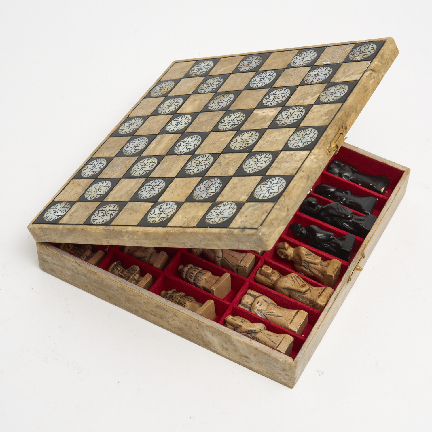A MARBLE CHESSBOARD WITH INLAID MOTHER-OF-PEARL AND CHESS SET HOUSED INSIDE W.20CM (BOARD)