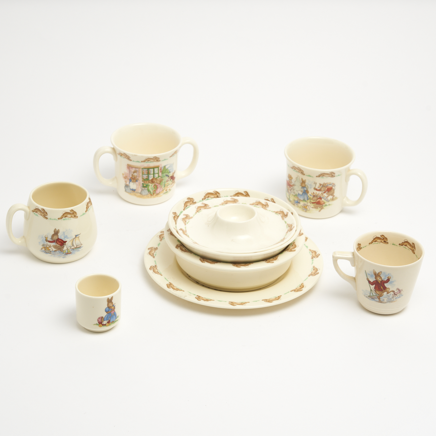 A COLLECTION OF NINE PIECES OF ROYAL DOULTON BUNNYKINS PORCELAIN CHILDREN'S WARE W.20CM (LARGEST)