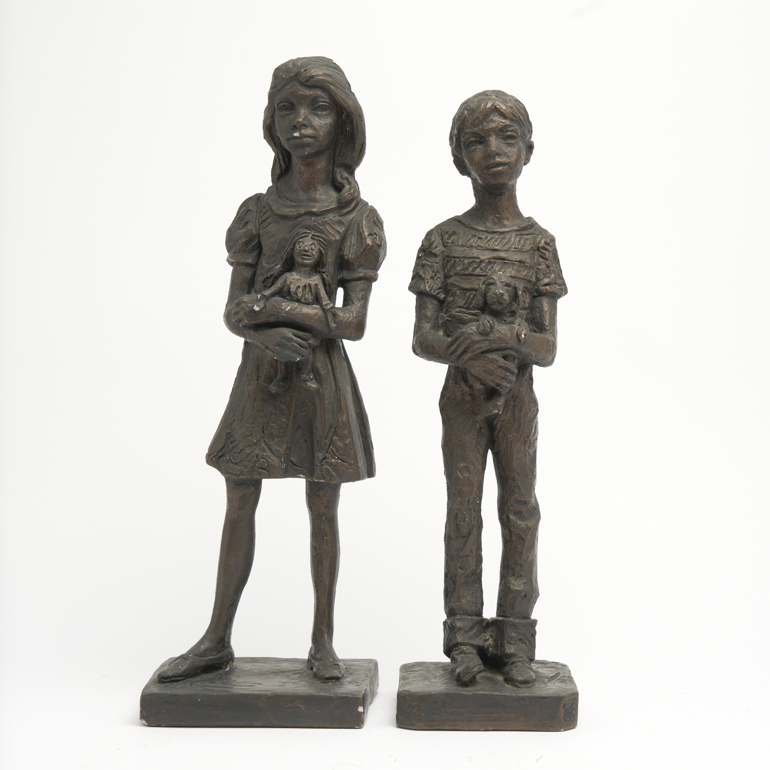 A PAIR OF BRONZED PLASTER STATUES OF A BROTHER AND SISTER, EACH SIGNED 'LEONARDO ART WKS INC 71' H.52CM (TALLEST)