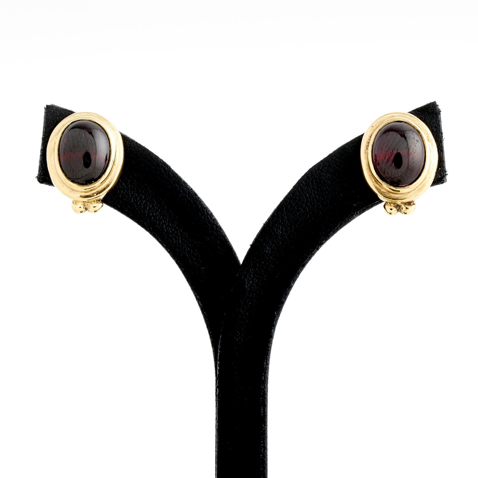A PAIR OF CABOCHON GARNET EARRINGS IN 9CT GOLD, TO POST AND BUTTERFLY FITTINGS, 14 X 11MM, 4.5GMS