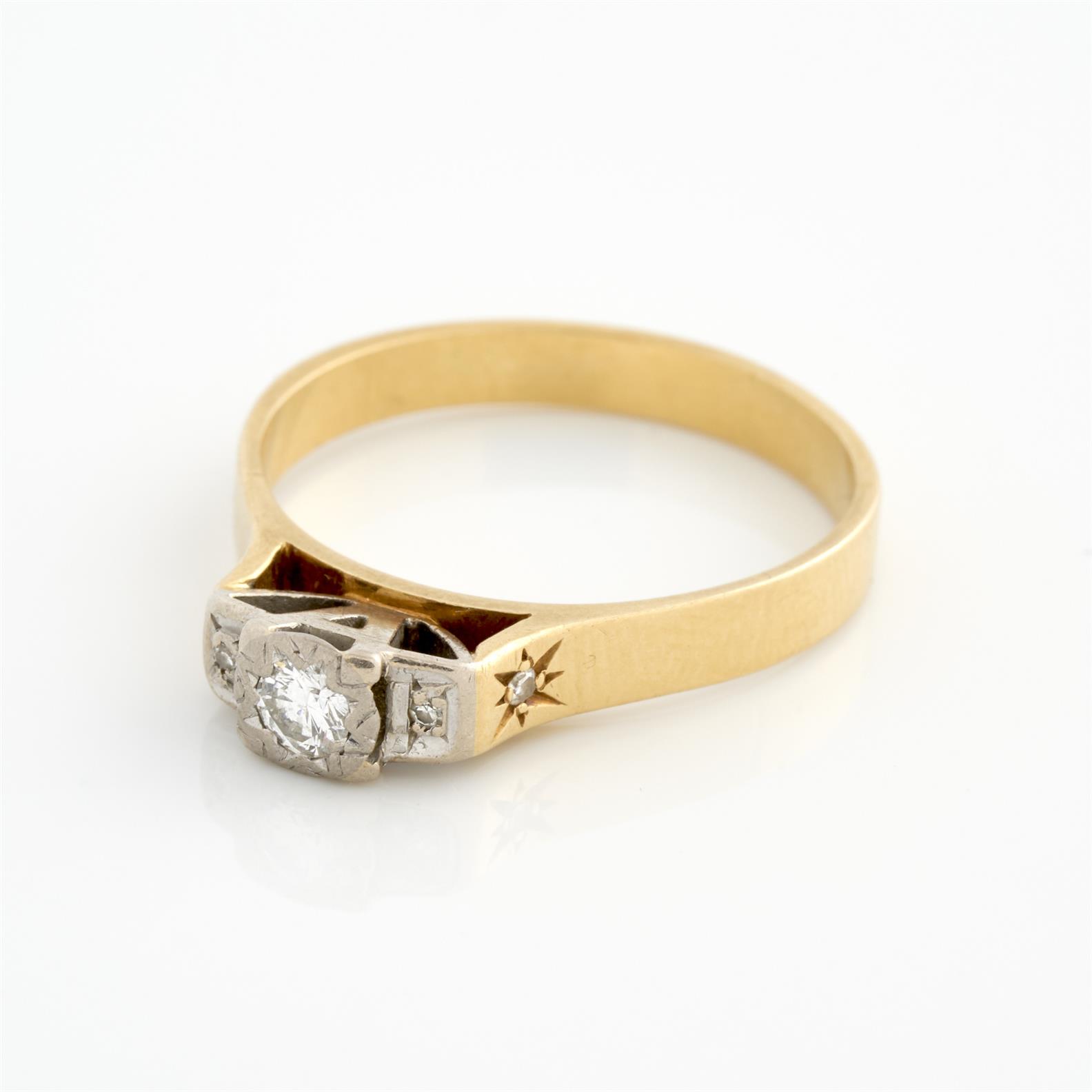 A THREE STONE DIAMOND RING IN 18CT GOLD AND PALLADIUM, SIZE T, 4.3GMS
