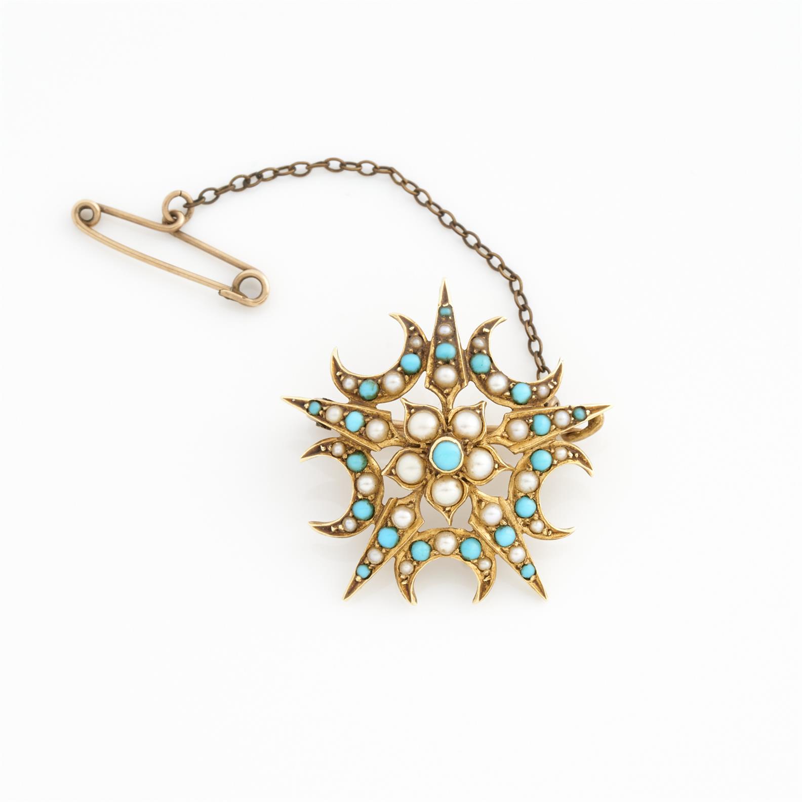 A 19TH CENTURY HALLMARKED, TURQUOISE AND SEED PEARL STAR AND CRESCENT FORM BROOCH IN 15CT GOLD, 5.8GMS