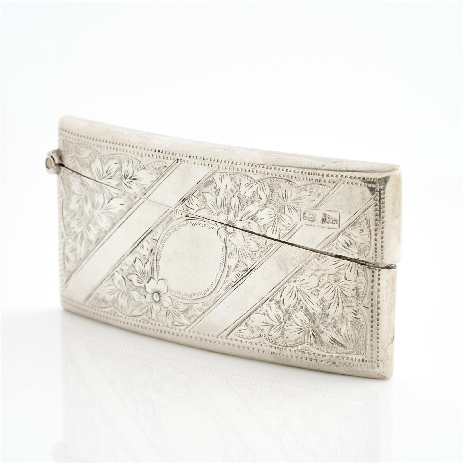 AN ENGLISH HALLMARKED, 1905'S WALKER AND HALL ETCHED FOLDING RECTANGULAR BUSINESS CARD CASE IN STERLING SILVER, 80 X 40MM
