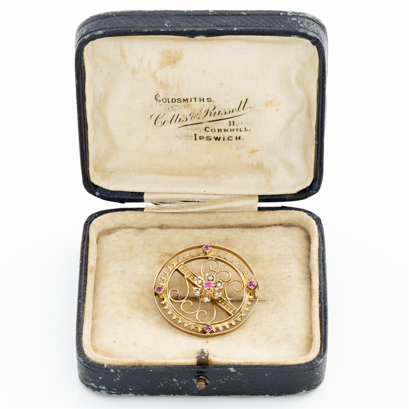 AN ANTIQUE RUBY AND SEED PEARL BROOCH IN 14CT GOLD, DIAMETER 30MM, ACCOMPANIED BY A BOX