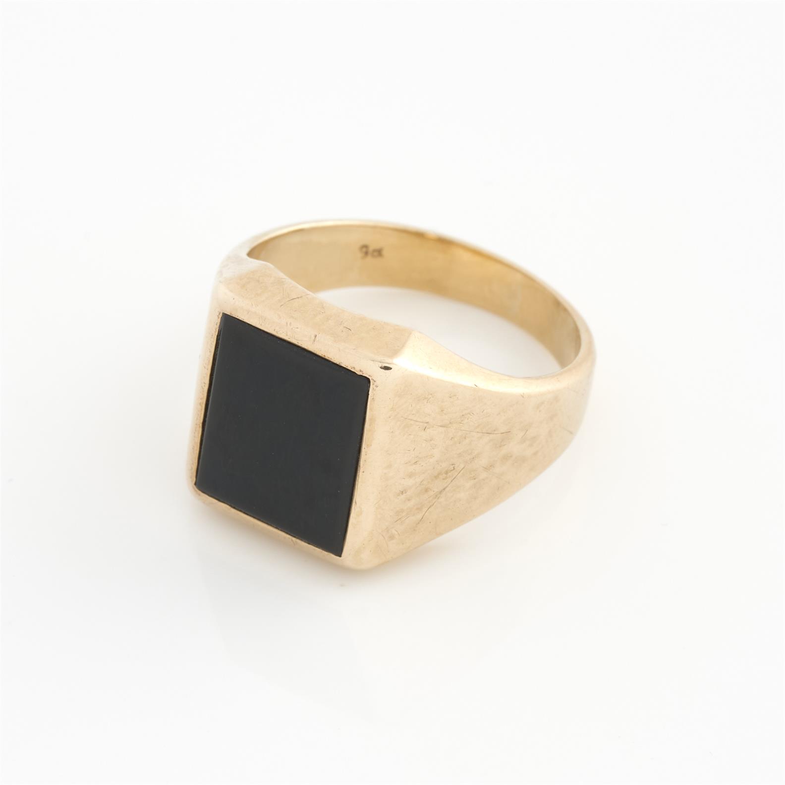 A VINTAGE ONYX SIGNET RING IN 9CT GOLD, SIZE S, 5.9GMS