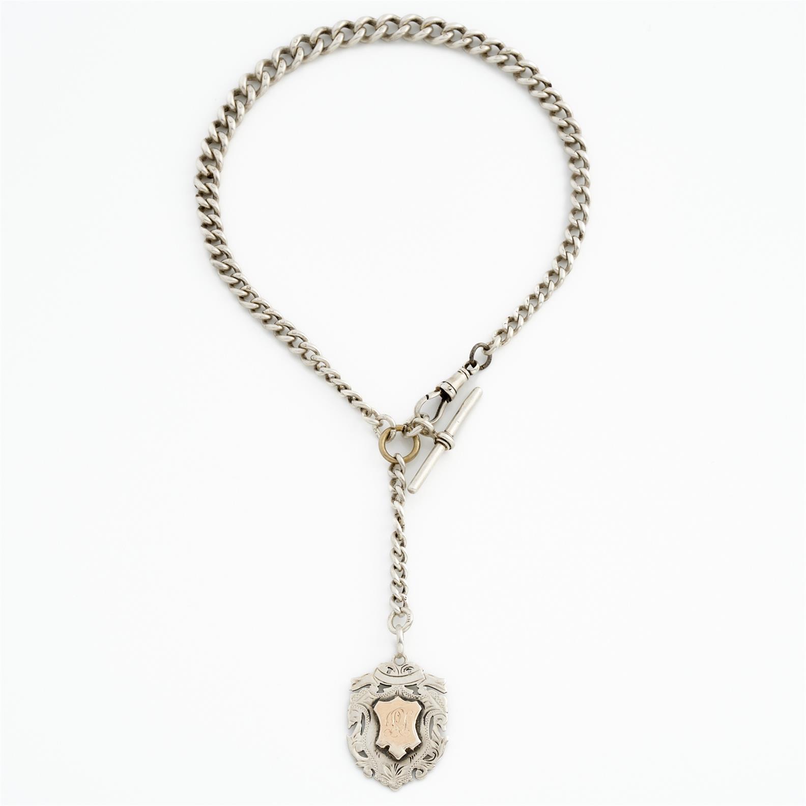 AN ANTIQUE FOB CHAIN NECKLACE IN STERLING SILVER, SUSPENDING A MEDALLION IN GOLD AND STERLING SILVER, BIRMINGHAM HALLMARKS, 300MM 45.6GMS