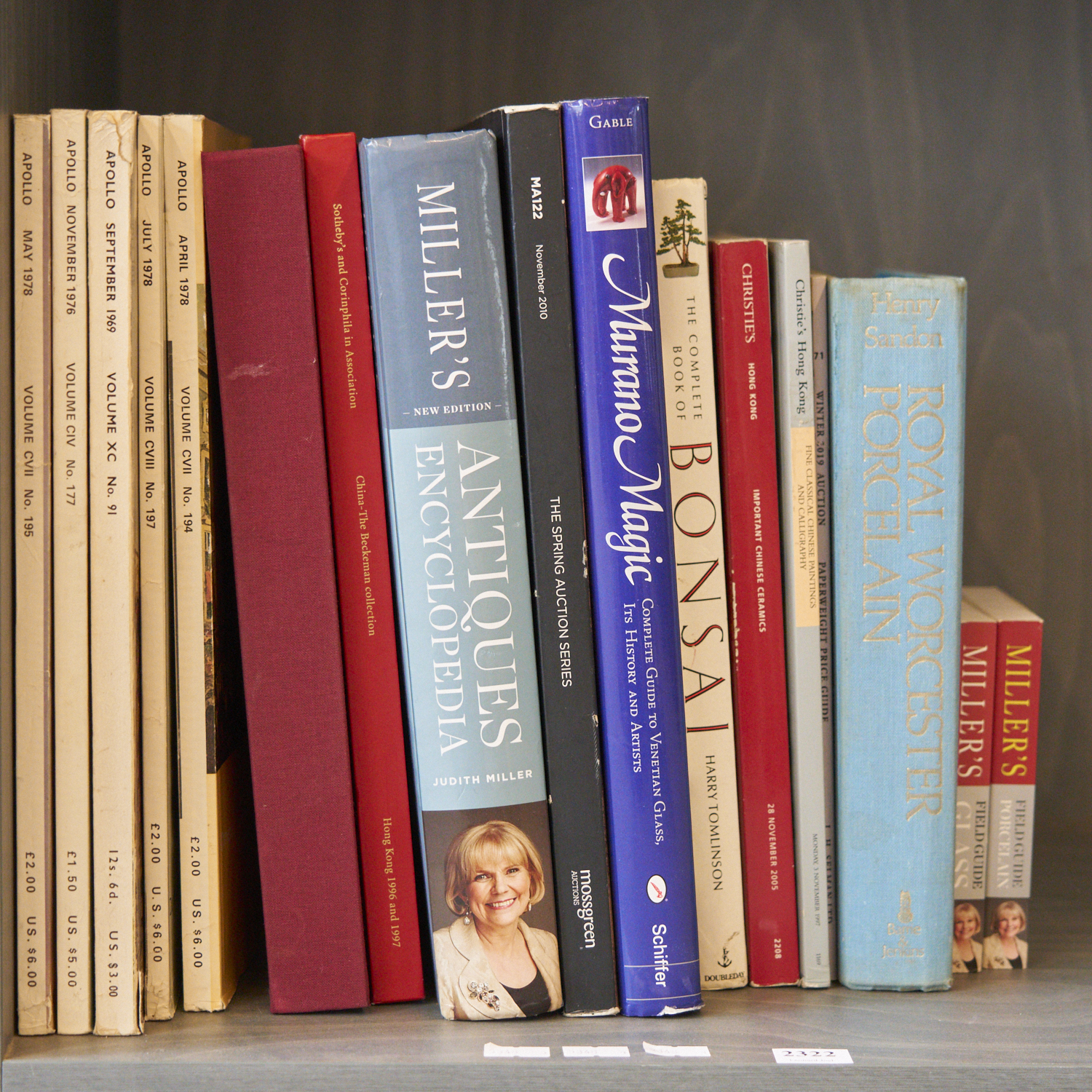 A SHELF OF ART AND ANIQUE REFERENCE BOOKS, INCLUDING MURANO MAGIC, MILLER'S ANTIQUE ENCYCLOPEDIA, AND ROYAL WORCESTER PORCELAIN