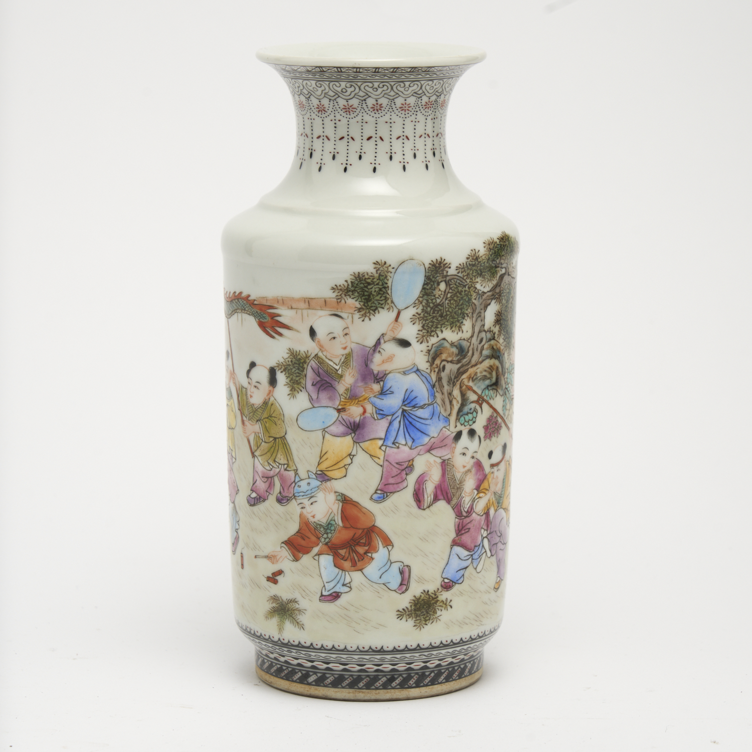 A CHINESE PORCELAIN VASE PAINTED WITH CHILDREN PLAYING DRAGON DANCE, FOUR-CHARACTER MARK TO THE BASE, H.23CM