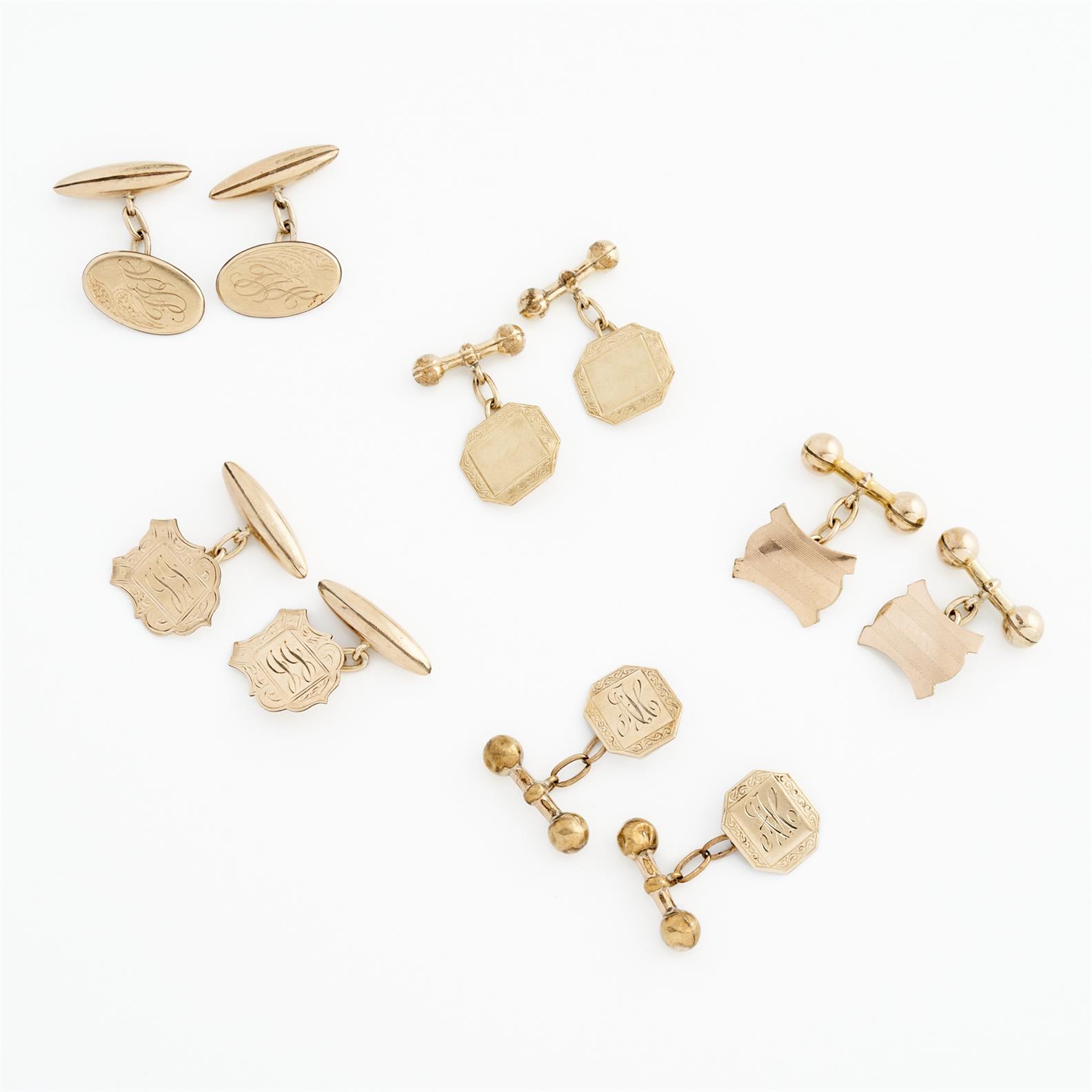 A COLLECTION OF FIVE PAIRS OF VINTAGE CUFFLINKS IN GOLD PLATE