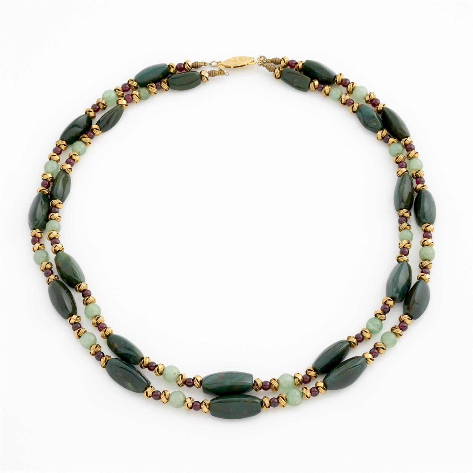 A GREEN HARDSTONE, JADE AND GARNET BEAD NECKLACE, 560MM