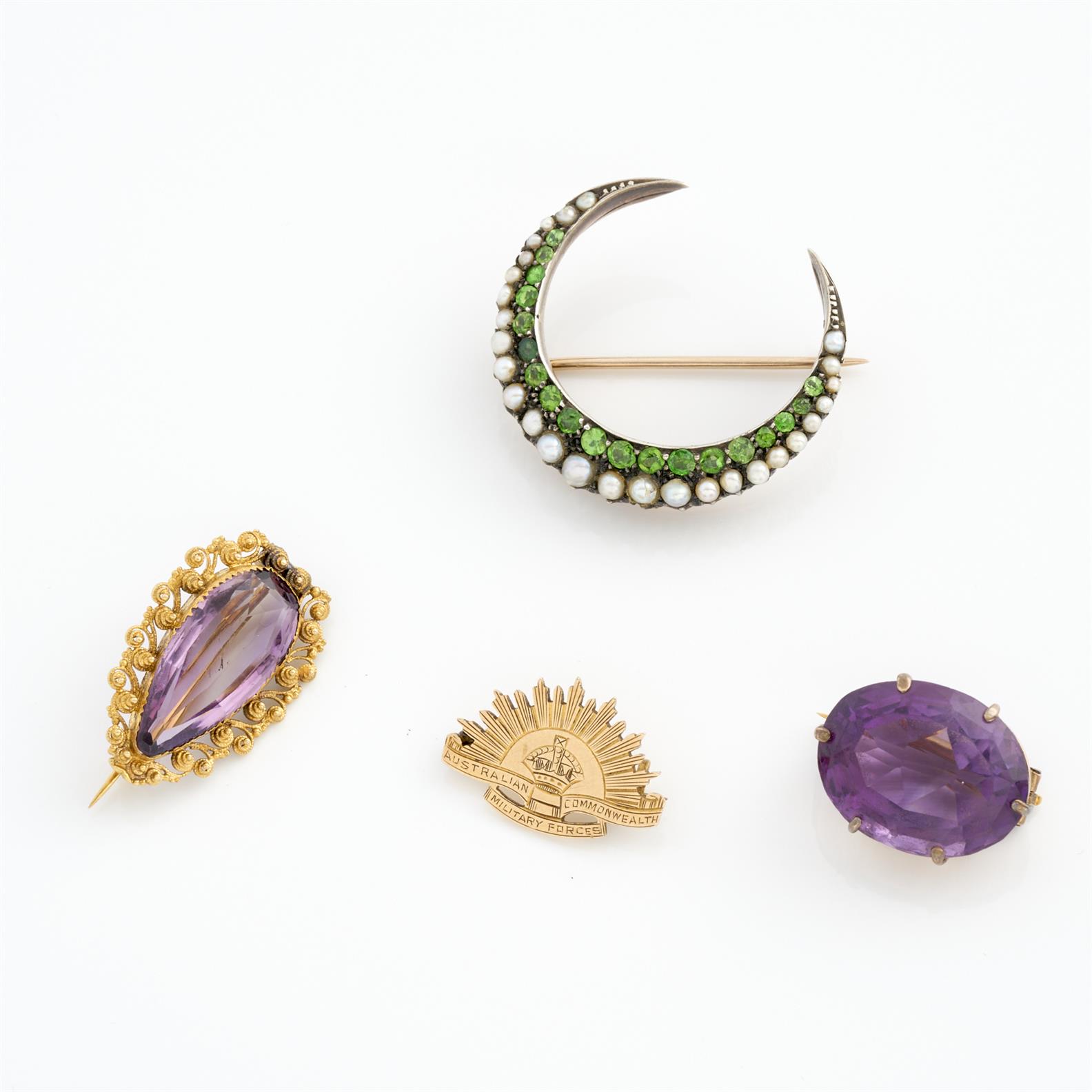AN ANTIQUE PASTE AND PEARL BROOCH CRESCENT IN 15CT GOLD, DIAMETER 38MM, TOGETHER WITH TWO ANTIQUE AMETHYST BROOCHES IN GOLD, ONE WITH AUSTRALIAN HALLMARKS AND AN AUSTRALIAN MILITARY BROOCH IN 15CT GOLD, 26.7GMS