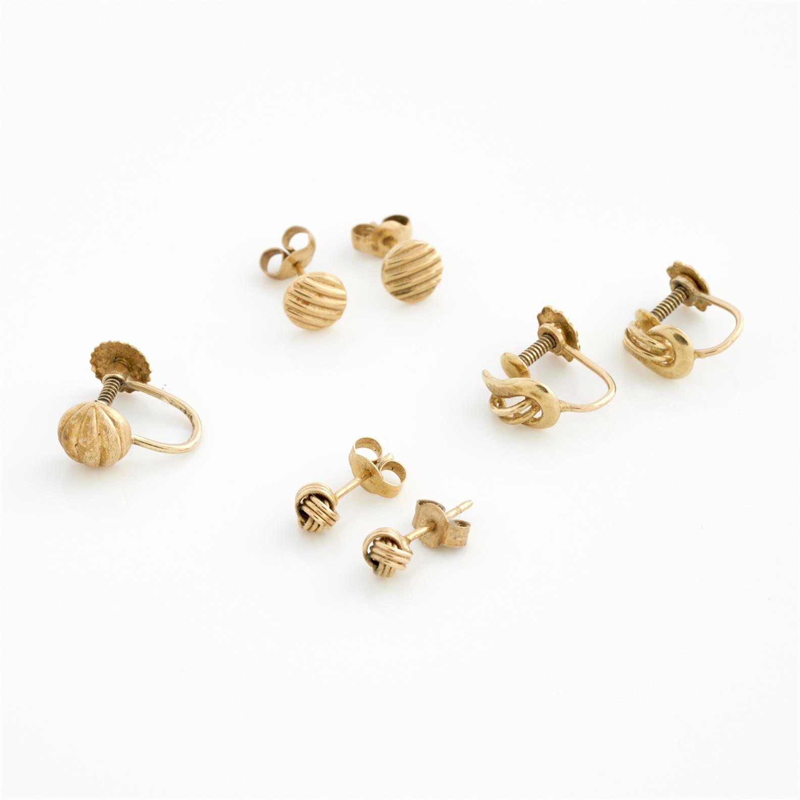 THREE PAIRS OF EARRINGS, TOGETHER WITH A SINGLE EARRING ALL IN 9CT GOLD, TO SCREWBACK AND POST AND BUTTERFLY FITTINGS, 3.6GMS