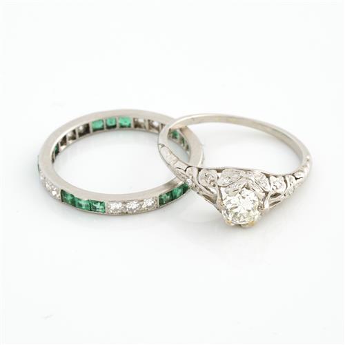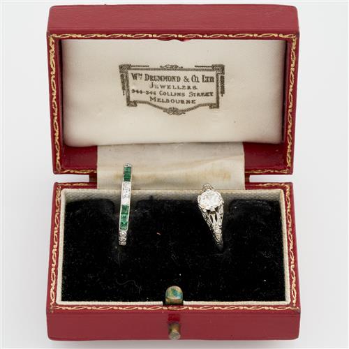 AN ANTIQUE DIAMOND RING IN PLATINUM, SIZE N, TOGETHER WITH A FULL CIRCLE EMERALD AND DIAMOND RING IN PLATINUM, SIZE O, 5.0GMS, ACCOMPANIED BY AN ANTIQUE WILLIAM DRUMMON & CO BOX