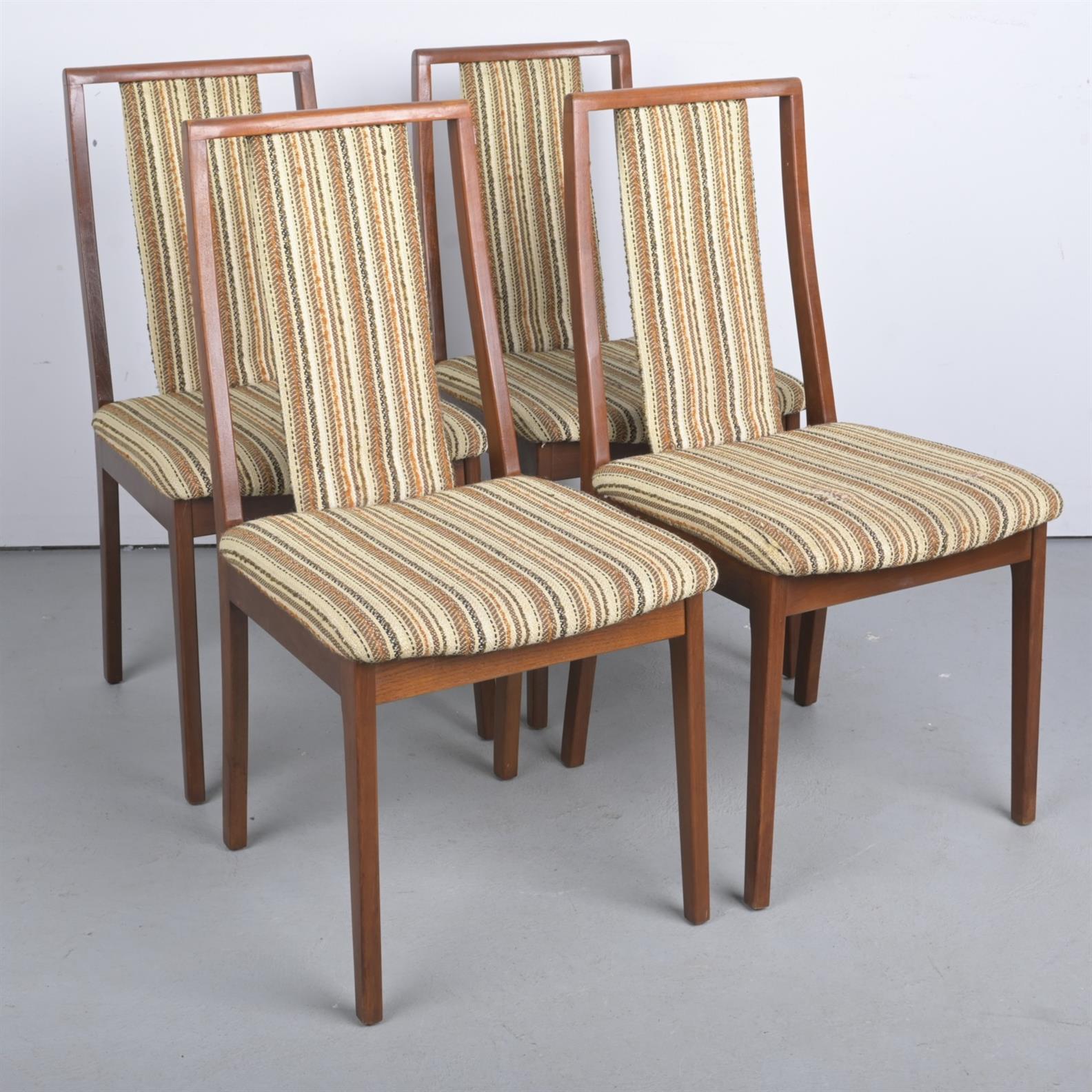 A SET OF FOUR TEAK NOBLETT DINING CHAIRS WITH STRIPED UPHOLSTERY (91H X 47W X 47D CM)