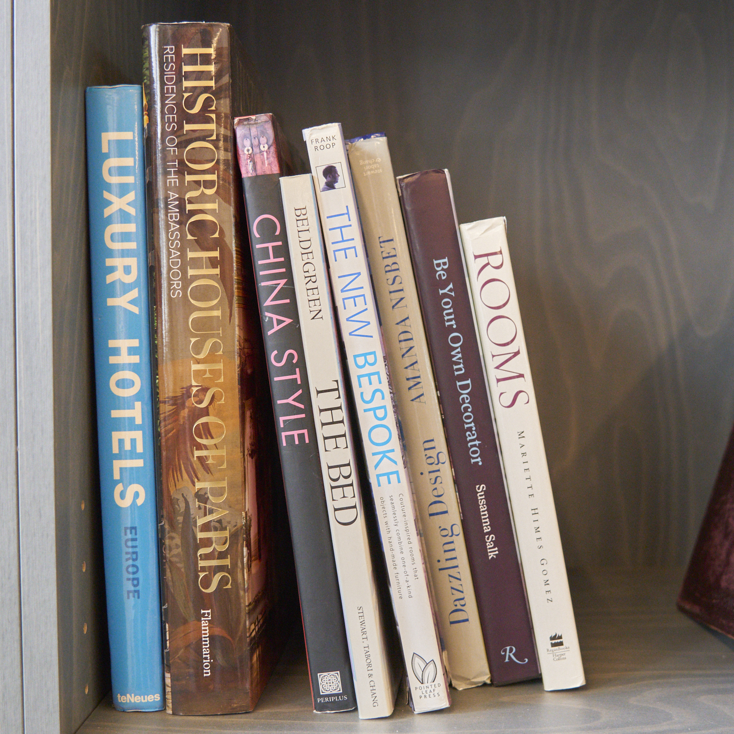 A PART SHELF OF INTERIOR DESIGN REFERENCE INCLUDING LUXURY HOTELS, HISTORIC HOUSES OF PARIS, AND THE BED