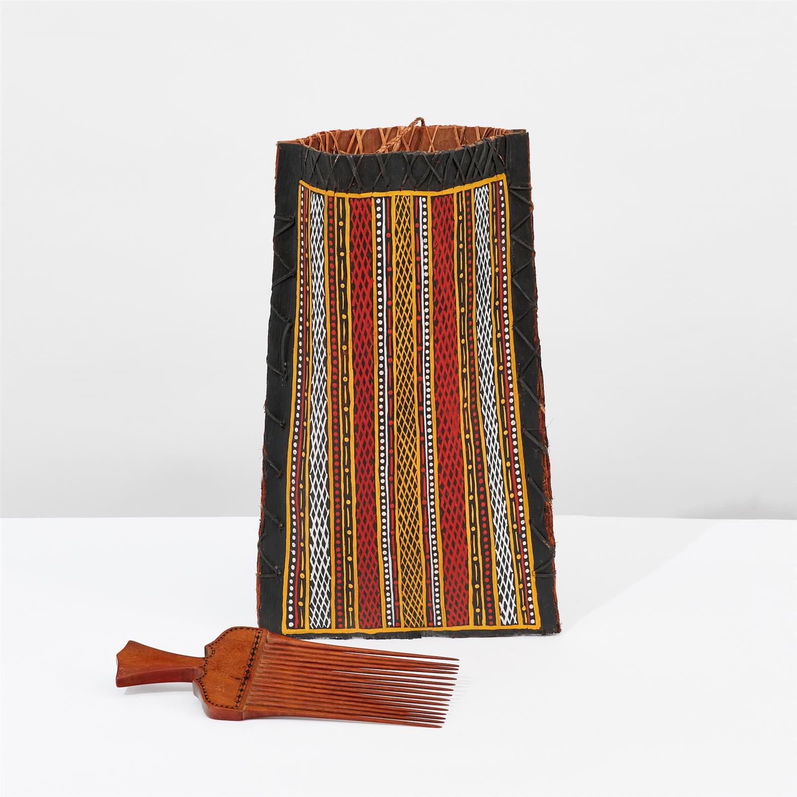 A BARK ‘DILLY BAG', CENTRAL AUSTRALIA, C.1970s; AND A SOLOMON ISLAND HAIR COMB (2)