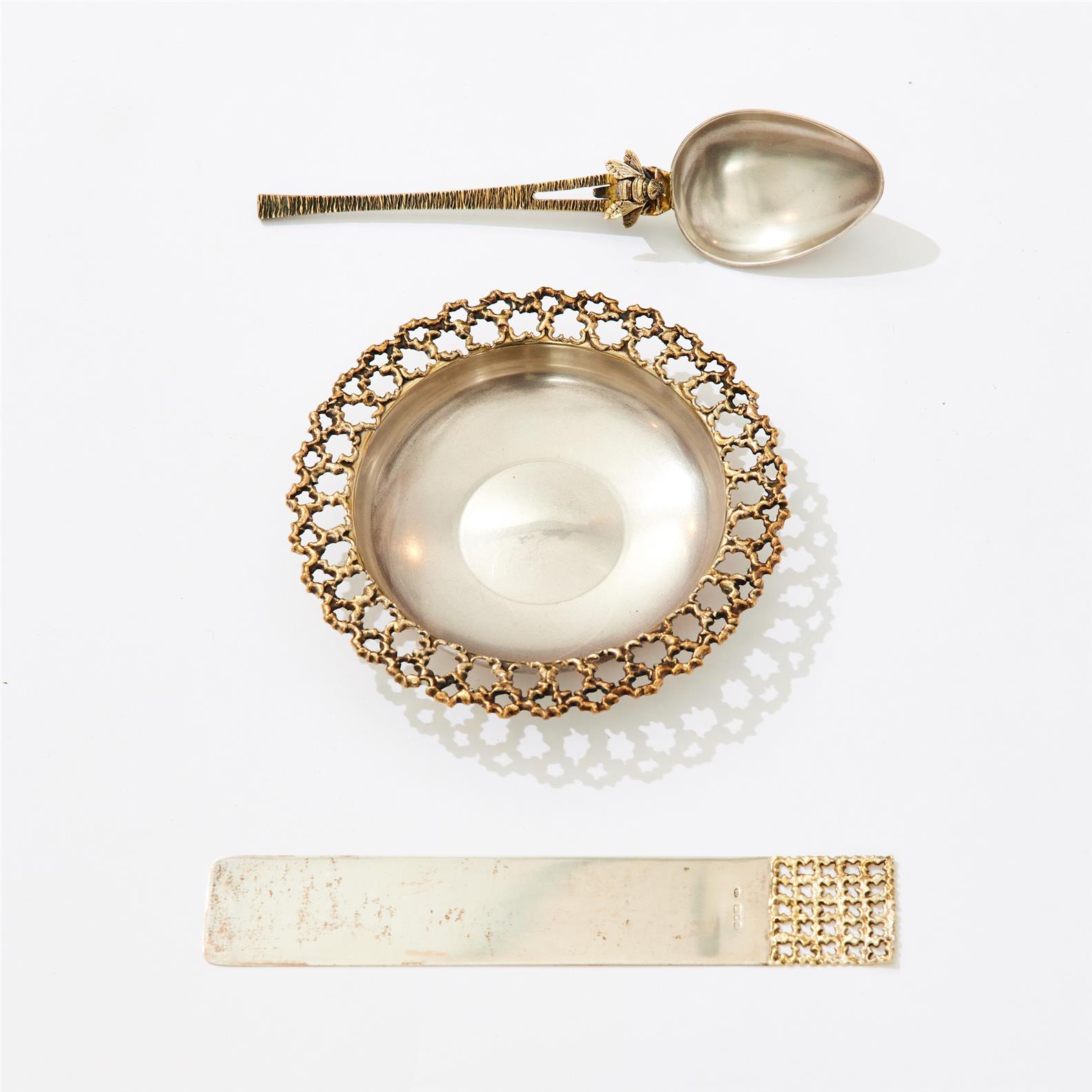 STUART DEVLIN (1931-2018): THREE PIECES OF SILVER GILT; AN ASHTRAY, LONDON 1977, A HONEY SPOON, LONDON 1978 AND A BOOKMARK, LONDON 1983