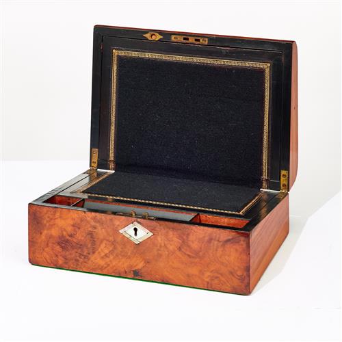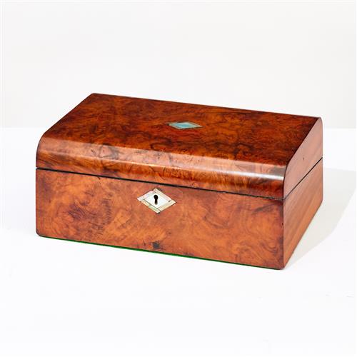 A VICTORIAN BURR WALNUT AND MOTHER OF PEARL WRITING SLOPE WITH LEATHER LINED INTERIOR