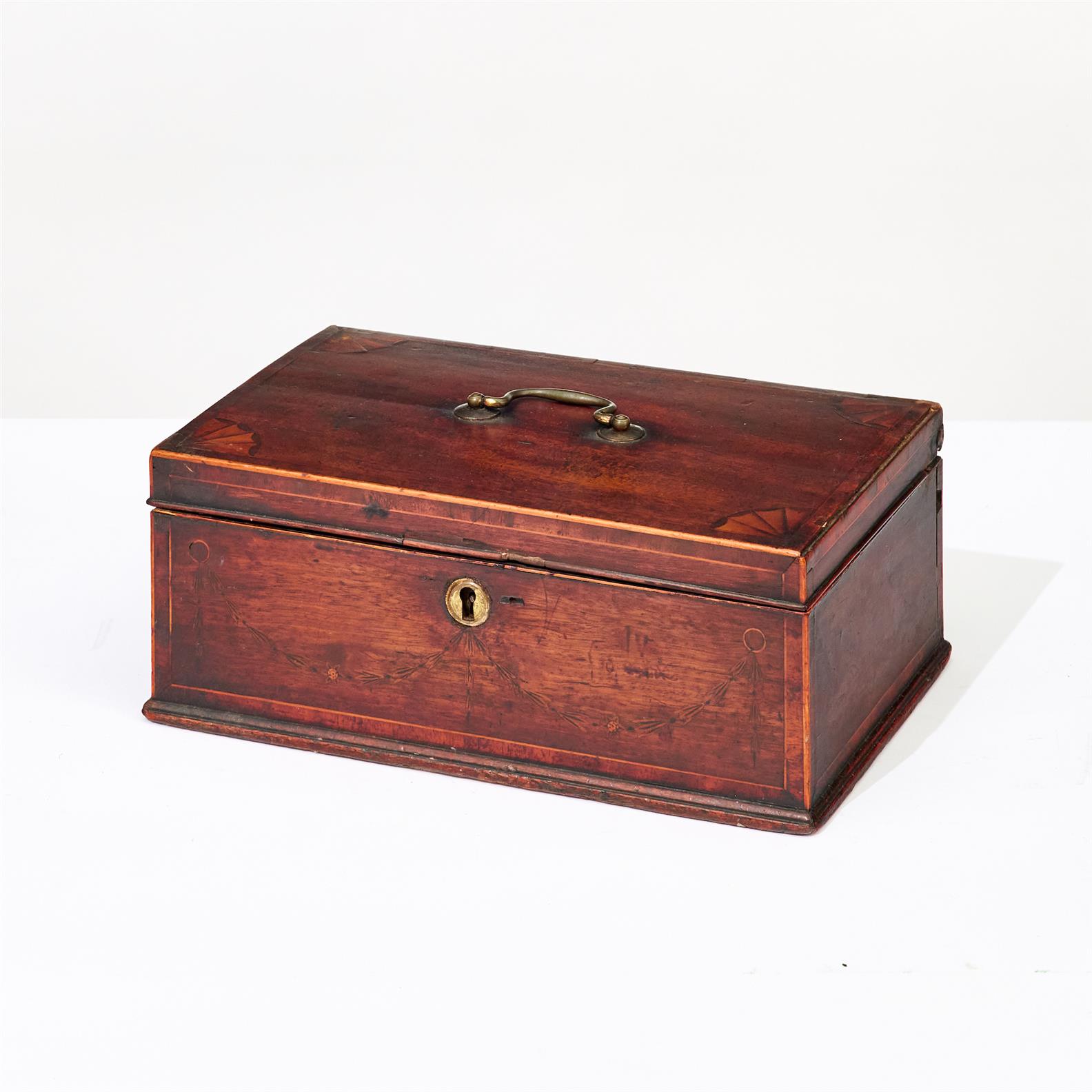 A GEORGIAN MAHOGANY VENEERED AND INLAID DOCUMENT BOX WITH PATERA CORNERS AND SWAGGED FRONT