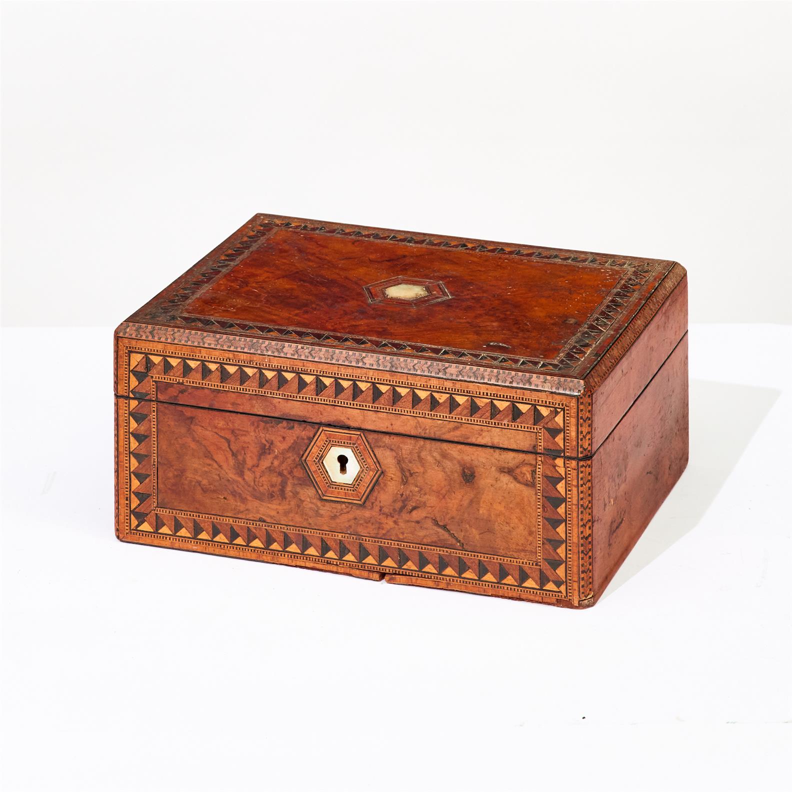 Extensive wear and some worm damage to cover, split to base, original silk lining very worn, no original implements but there is a tortoiseshell spindle, and a metal and stone page cutter.