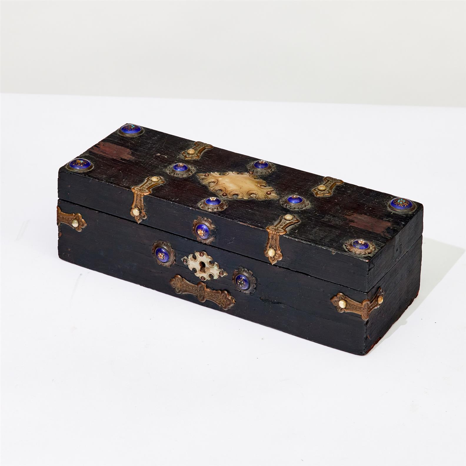 Overall wear, abrasions and nicks consistent with age and use, loss to brass mount at each end of lid, remnants of red fabric lining to interior, leather to underside of base with losses.
