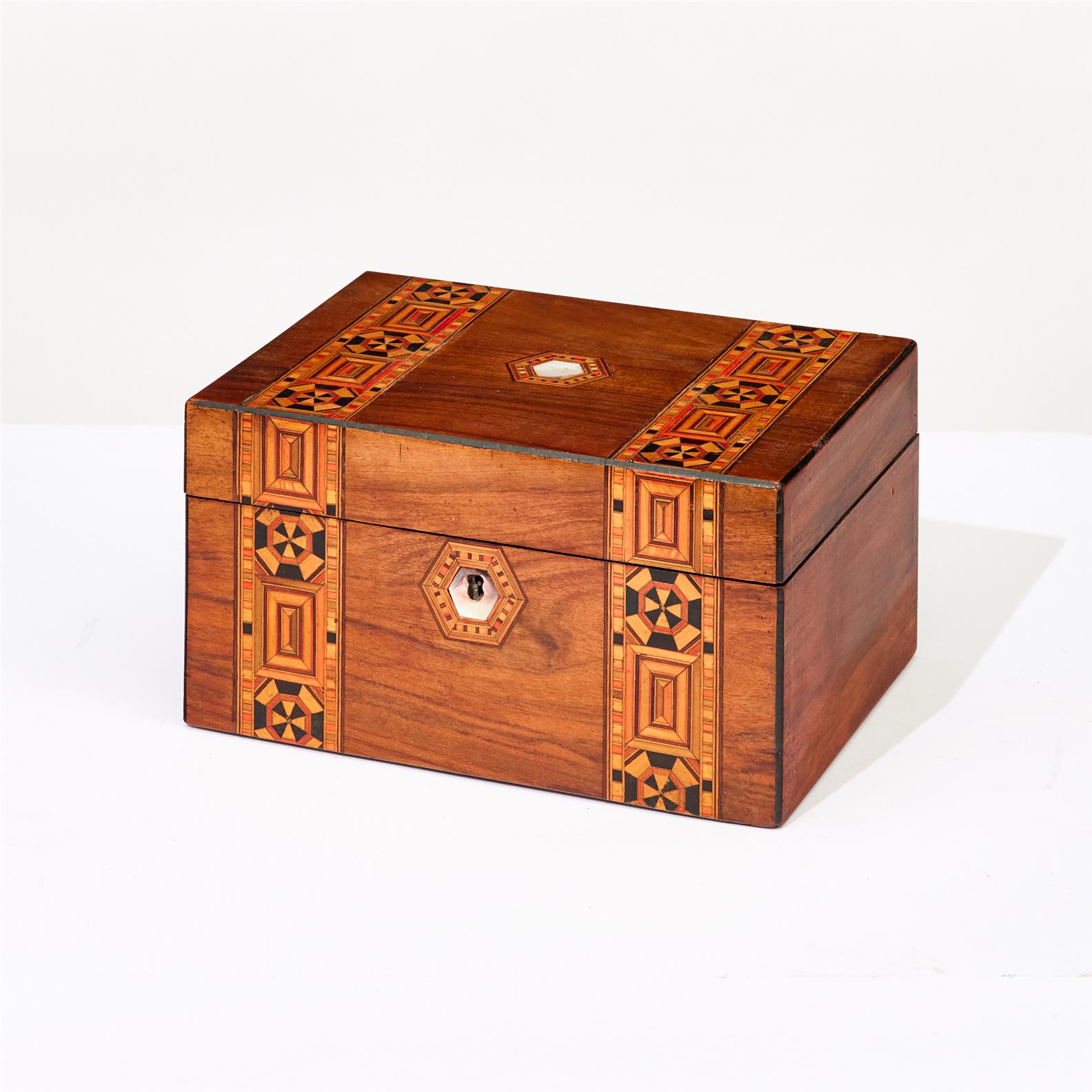 A VICTORIAN WALNUT AND TUNBRIDGE BANDED BOX WITH MOTHER OF PEARL PLAQUE
