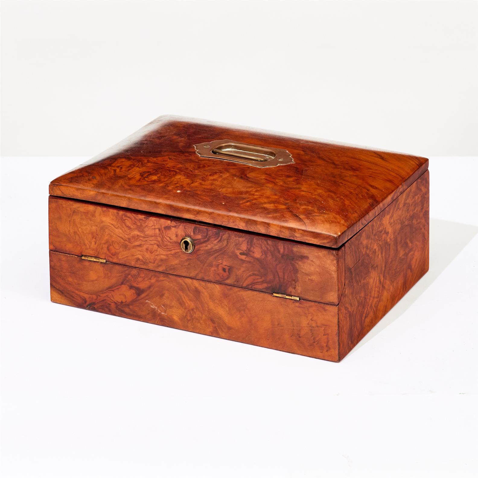 A VICTORIAN WALNUT CORRESPONDENCE CASE, WITH BRASS HANDLE AND HINGED SLOPE TO FITTED INTERIOR