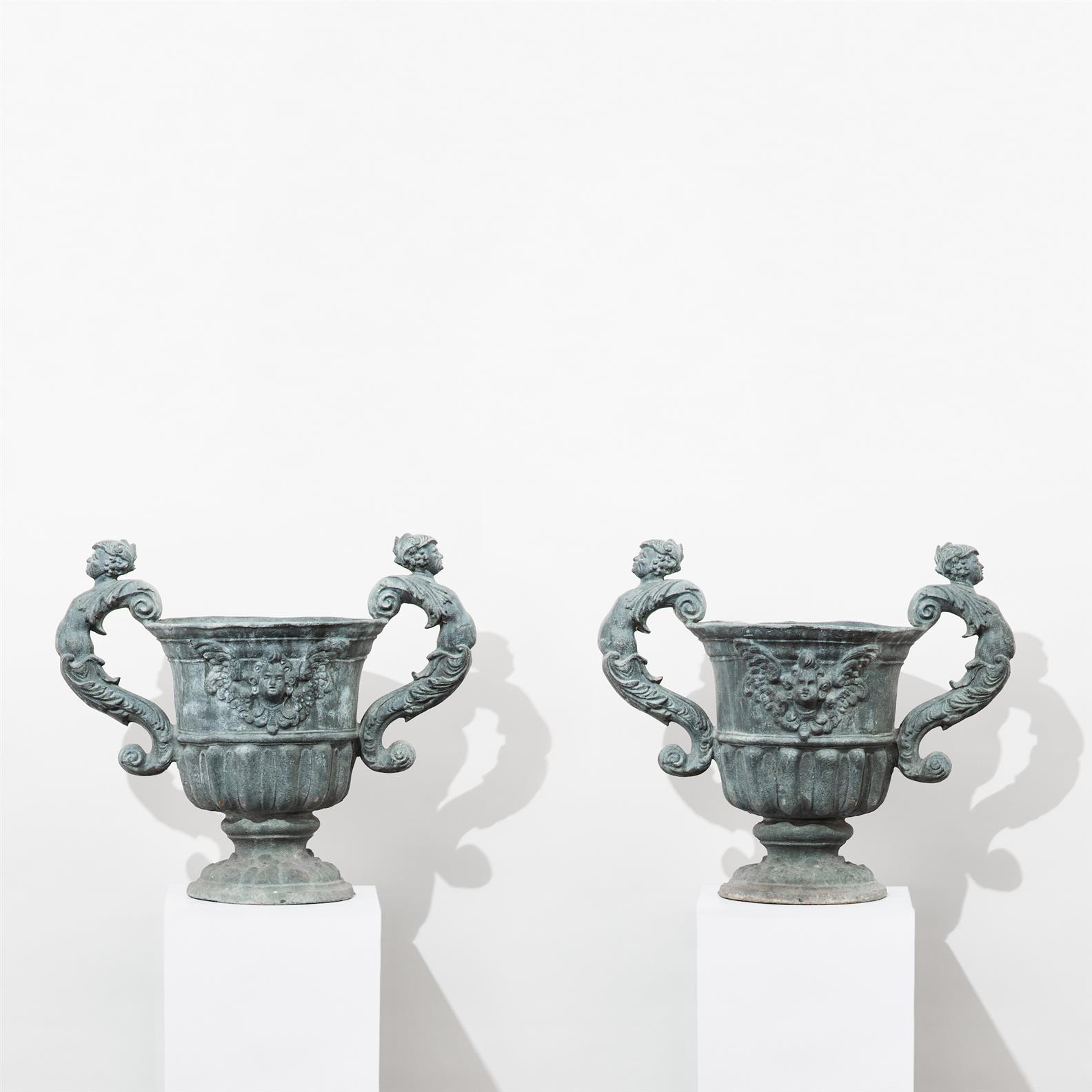 A PAIR OF MODERN LEAD GARDEN URNS IN THE 17TH CENTURY STYLE EACH WITH PUTTO CAPPED SCROLL HANDLES AND CHERUBIM MASK FRIEZE